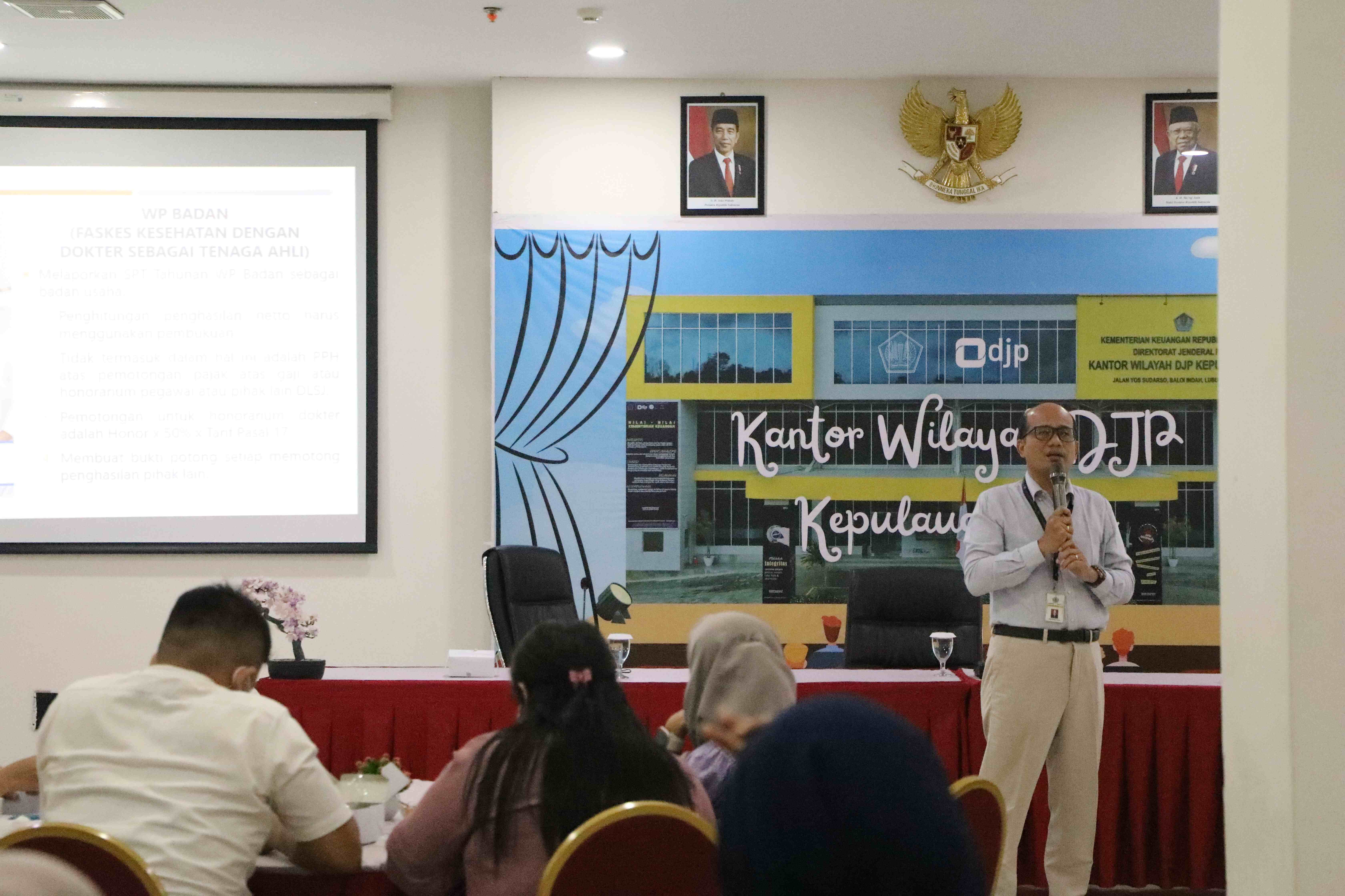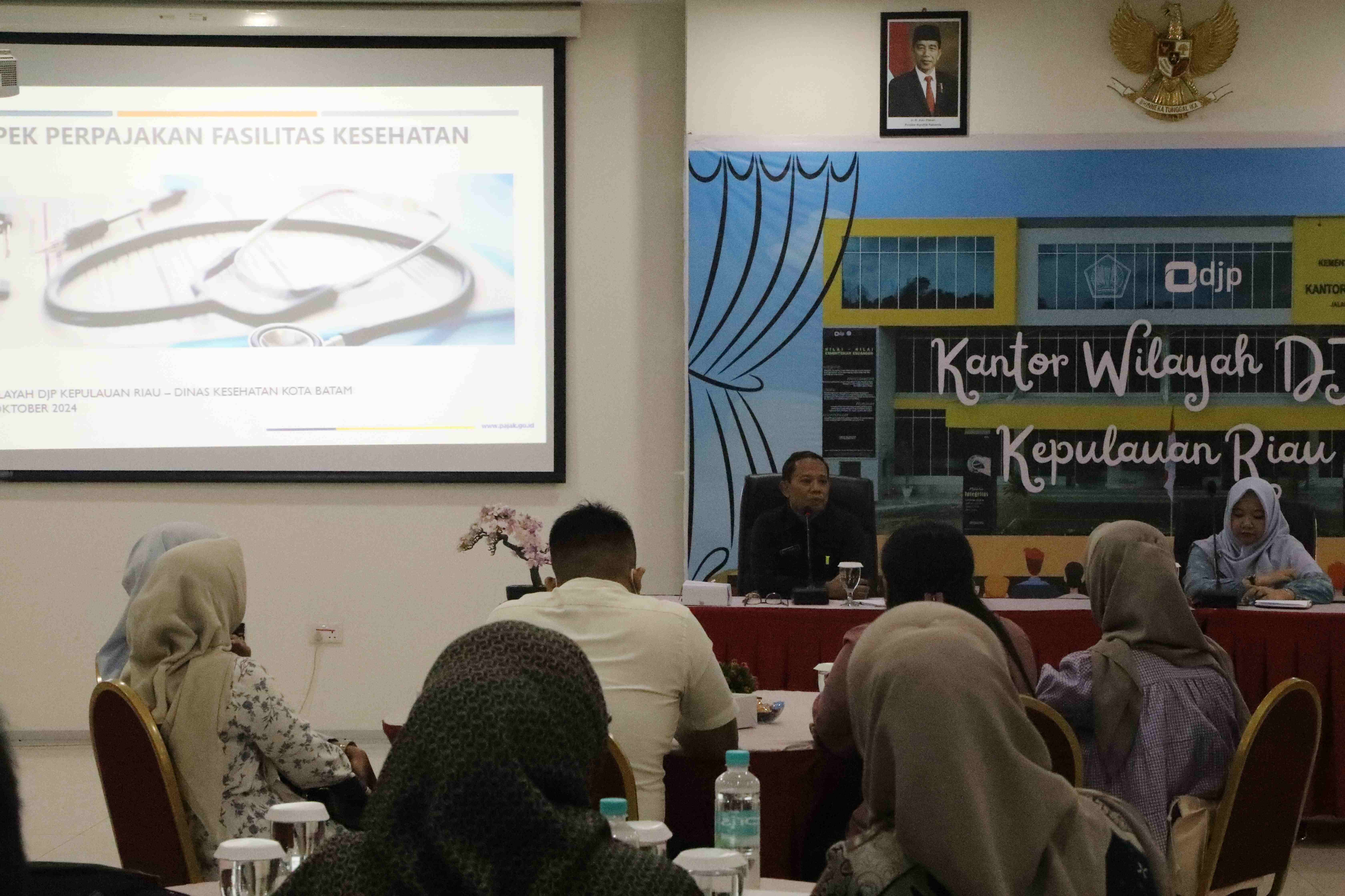 Kantor Wilayah Direktorat Jenderal Pajak Kepulauan Riau (Kanwil DJP Kepri) mengadakan sosialisasi kewajiban perpajakan bagi penyedia fasilitas kesehatan (faskes) di Aula Kanwil DJP Kepri, Kota Batam (Kamis, 17/10). Tim penyuluh pajak Kanwil DJP Kepri bersama dengan tim penyuluh pajak dari Kantor Pelayanan Pajak (KPP) se-Batam mengundang 42 penyedia fasilitas kesehatan di Kota Batam dan dihadiri oleh 49 peserta.