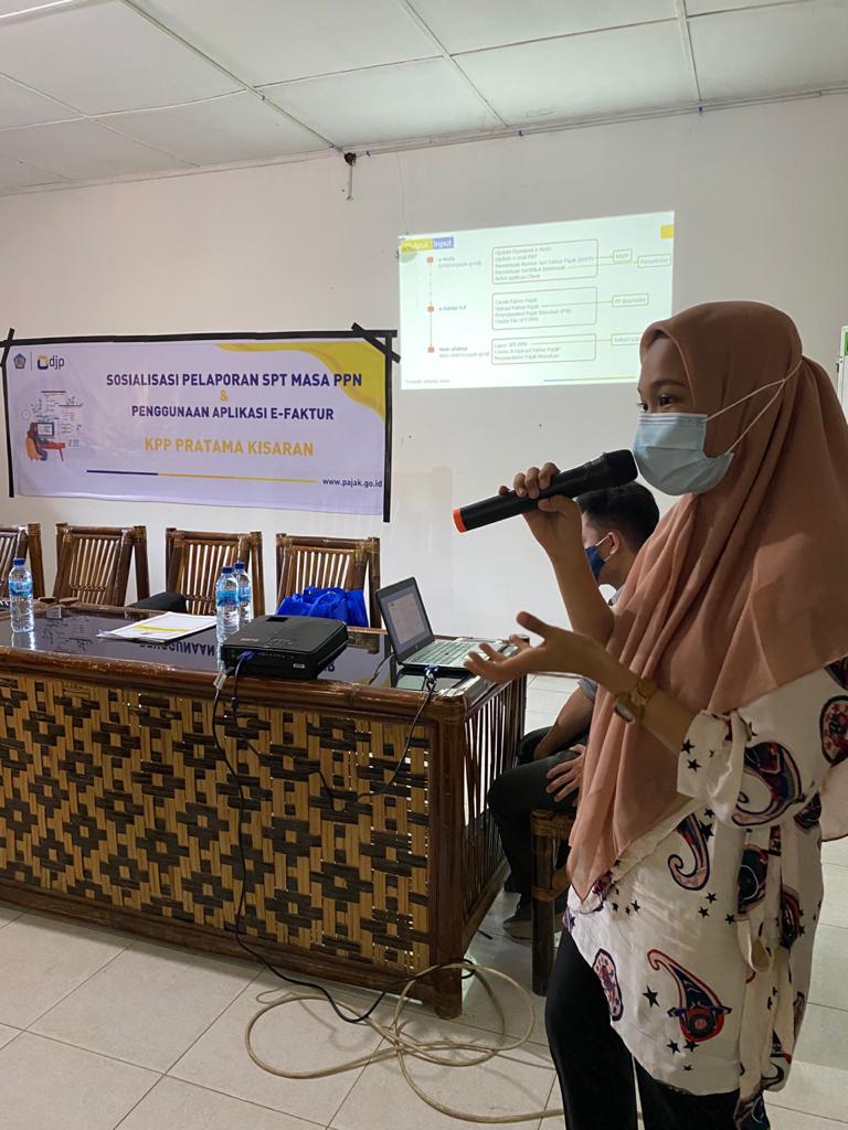 Hadir sebagai narasumber adalah Asisten Penyuluh Pajak dari KPP Pratama Kisaran Winston dan Dhea Ashifa Swara. Wiston menjelaskan bahwa kegiatan ini bertujuan untuk memberikan pemahaman kepada Pengusaha Kena Pajak mengenai pengisian SPT Masa PPN dan penggunaan aplikasi e-faktur. Kegiatan diawali dengan pemberian materi sosialisasi oleh narasumber, kemudian dilanjutkan dengan sesi diskusi dan tanya jawab.