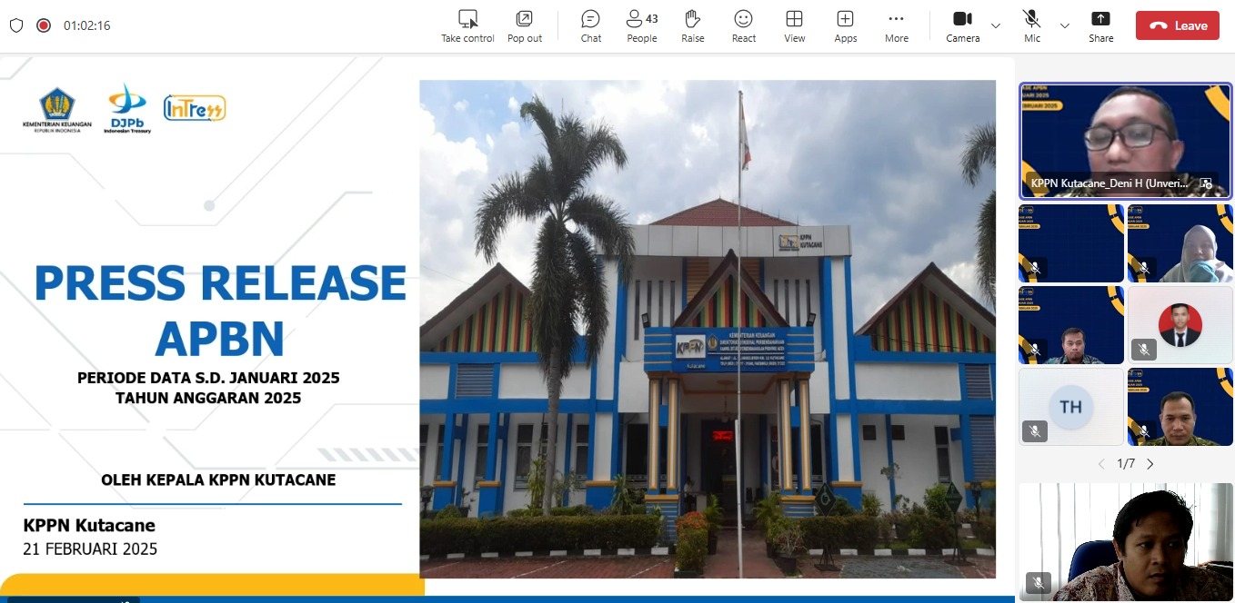 Kantor Pelayanan, Penyuluhan, dan Konsultasi Perpajakan (KP2KP) Kutacane bersama Kantor Pelayanan Perbendaharaan Negara (KPPN) Kutacane menyelenggarakan kegiatan Press Release Pelaksanaan Anggaran Pendapatan dan Belanja Negara (APBN) Periode Januari 2025 secara daring (Jumat, 21/2).