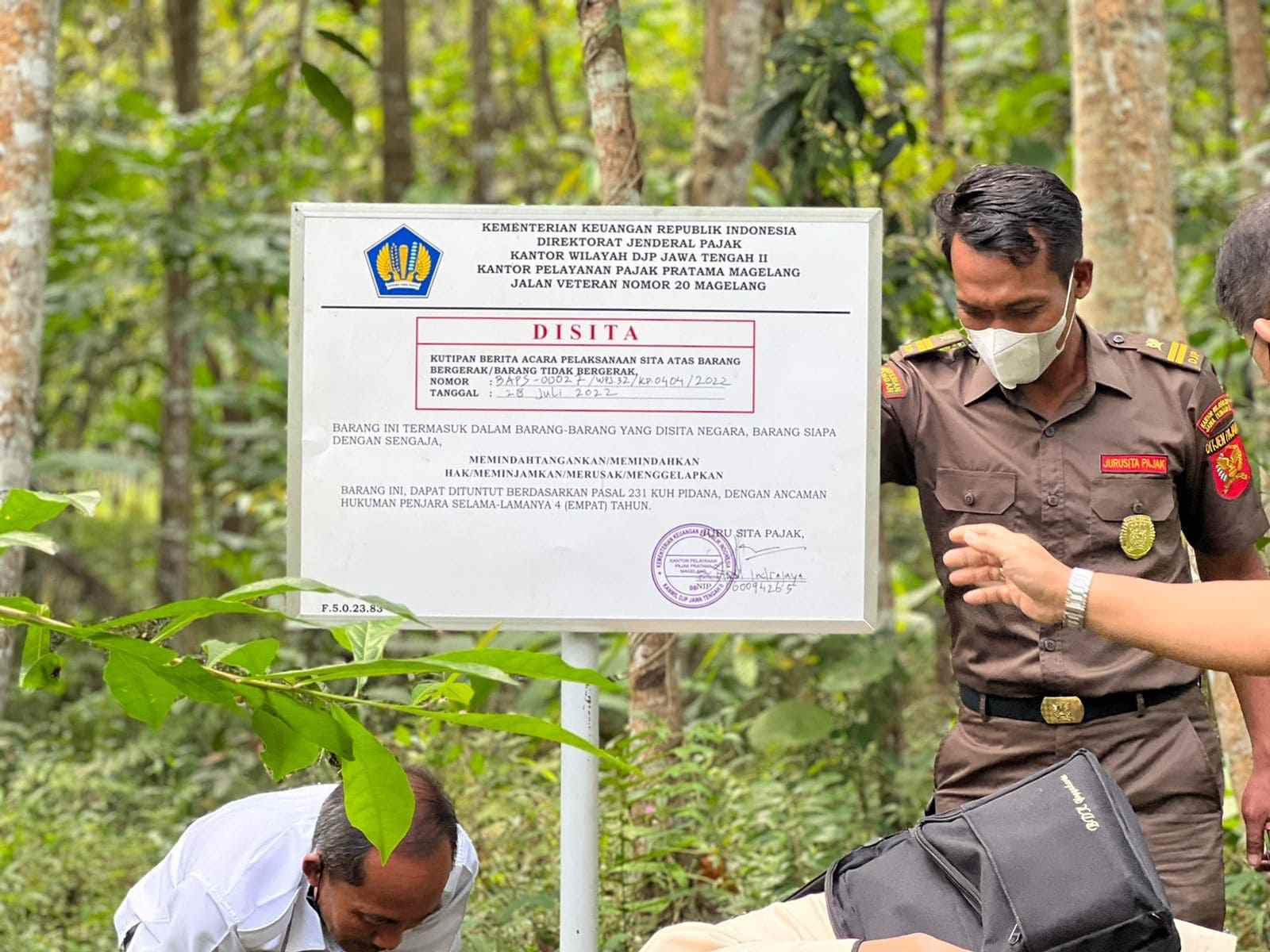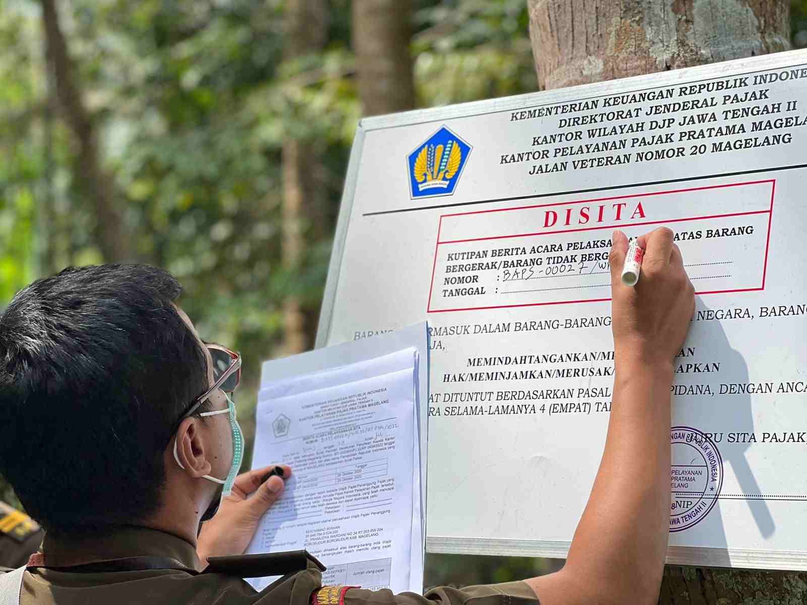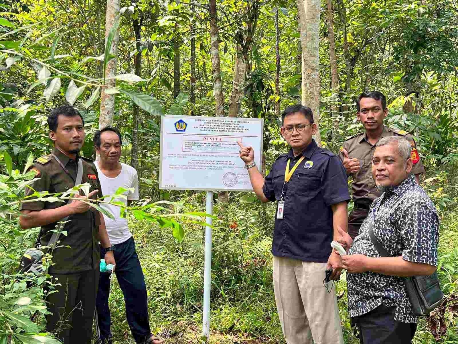 Tim Penagihan Kantor Pelayanan Pajak (KPP) Pratama Magelang melakukan pemasangan papan SITA di Desa Kalinegoro Mertoyudan Kabupaten Magelang (Kamis, 28/07). Pemasangan papan sita dilakukan bersamaan dengan pelaksanaan sita berupa sebidang tanah dengan luas 650 m2 milik Wajib Pajak Orang Pribadi inisial MI yang belum melunasi tunggakan pajak.