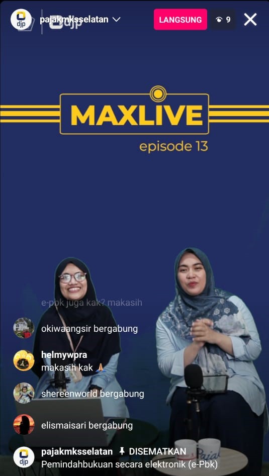 Live Instagram yang dilaksanakan oleh tim penyuluh pajak KPP Pratama Makassar Selatan mengambil tema e-Pbk. Live Instagram merupakan kegiatan rutin yang dilaksanakan oleh tim penyuluh KPP Pratama Makassar Selatan untuk menjangkau pengikut Instagram KPP Pratama Makassar Selatan.