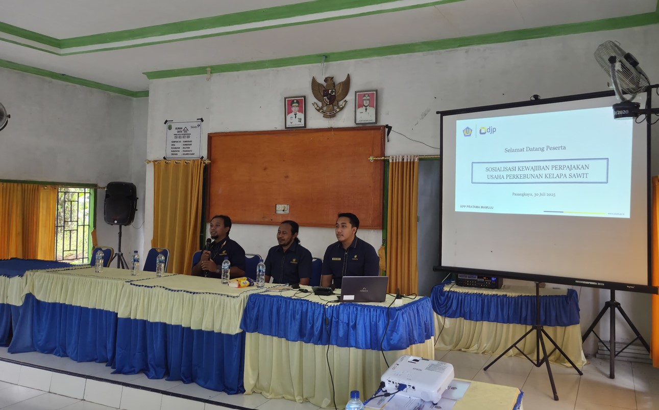Kantor Pelayanan Pajak (KPP) Pratama Mamuju menggelar sosialisasi kewajiban perpajakan bagi pelaku usaha kelapa sawit di Aula Desa Sumber Sari, Kecamatan Bulutaba, Kabupaten Pasangkayu (Selasa, 29/7). Kegiatan ini diikuti oleh masyarakat yang telah memiliki nomor pokok wajib pajak (NPWP) dan tergolong dalam kelompok lapangan usaha (KLU) petani atau perkebunan.