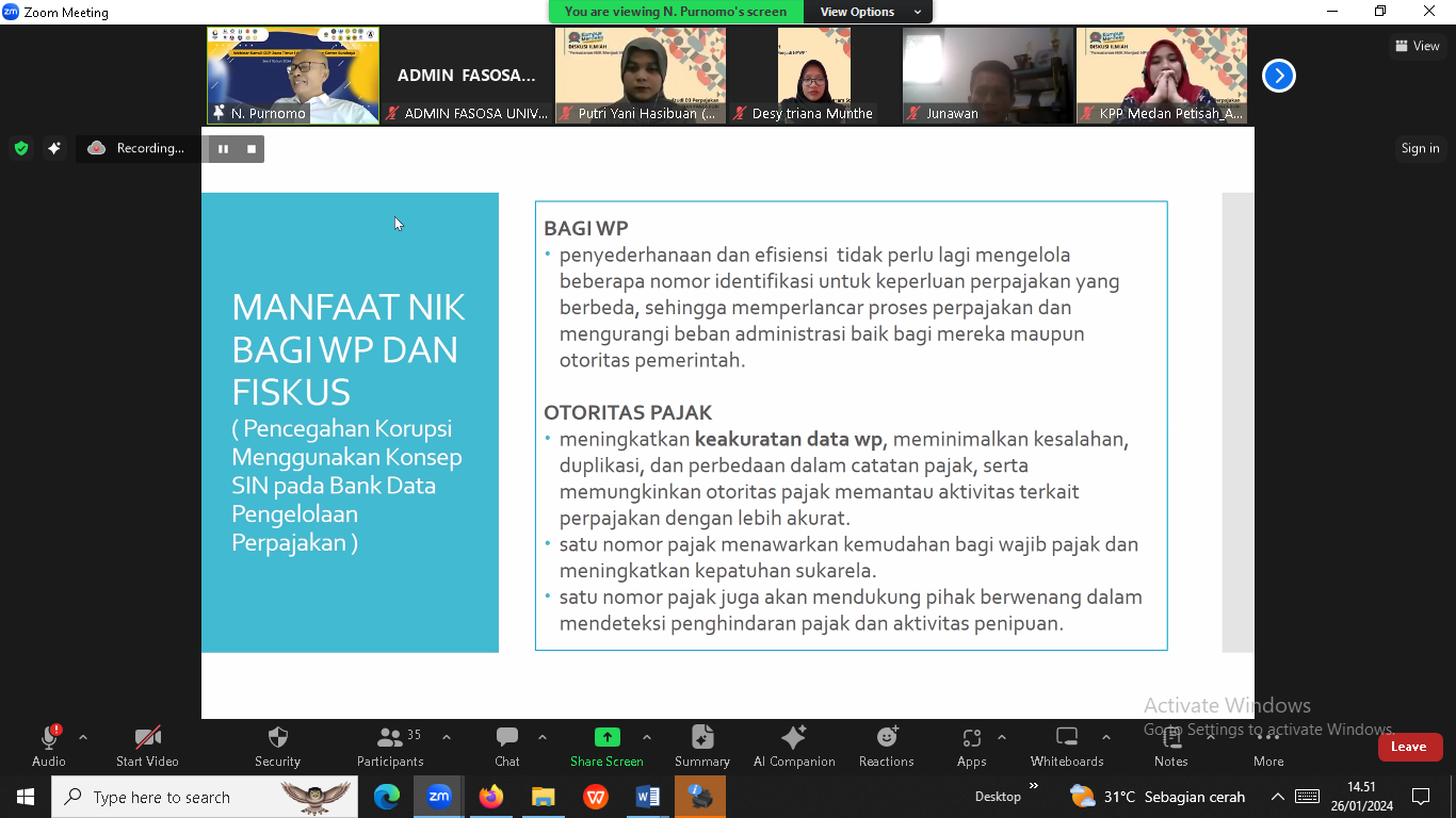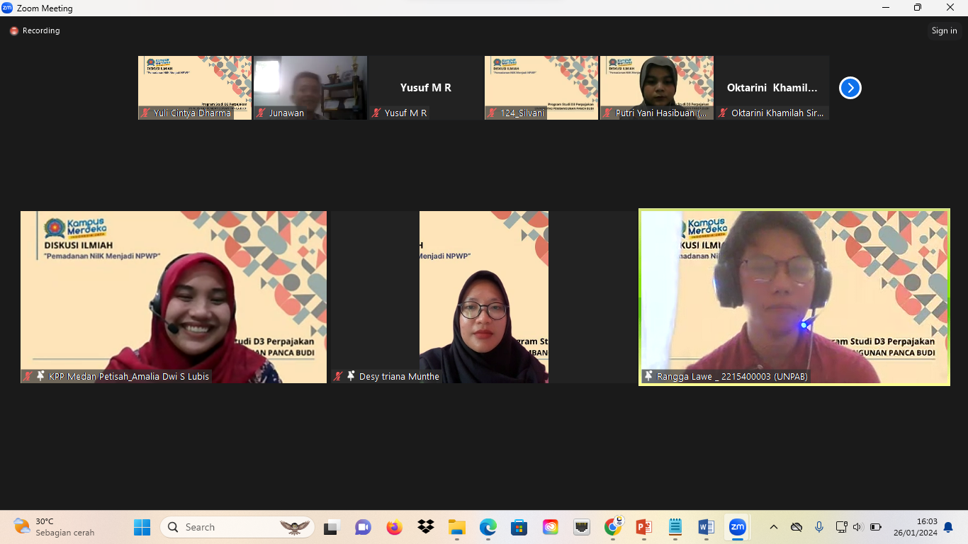 Kantor Pelayanan Pajak (KPP) Pratama Medan Petisah bersama dengan Program Studi D3 Perpajakan Universitas Pembangunan Panca Budi menggelar Studi Ilmiah terkait Pemandanan Nomor Induk Kependudukan (NIK) menjadi Nomor Pokok Wajib Pajak (NPWP) (Jumat, 26/1). Kegiatan dilaksanakan secara daring melalui aplikasi Zoom Meeting diikuti oleh 30 mahasiswa dan 5 Dosen. Program ini dilaksanakan dalam rangka studi ilmiah perpajakan yang rutin dilaksanakan bersama Tax Centre Pancabudi dalam 3 tahun terakhir. Kegiatan Kali ini mengusung tema Validasi NIK menjadi NPWP bertujuan untuk memberikan pemahaman kepada mahasiswa tentang latar belakang dan tujuan Pemandanan NIK menjadi NPWP.