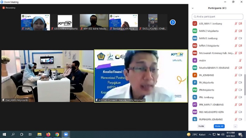 Kantor Pelayanan Pajak (KPP) Pratama Mojokerto bekerja sama dengan Kantor Pelayanan Perbendaharaan Negara (KPPN) Mojokerto mengadakan sosialisasi Undang-Undang Harmonisasi Peraturan Perpajakan (UU HPP) secara daring melalui aplikasi Zoom Meeting di Mojokerto (Kamis, 2/6).