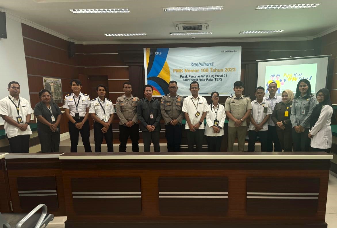 Kantor Pajak Namlea lakukan edukasi perpajakan kepada seluruh bendahara instansi vertikal di Namlea, Kabupaten Buru. Dihadiri 15 peserta, materi yang disampaikan terkait dengan Peraturan Menteri Keuangan (PMK) 168/2023 atau yang lebih dikenal dengan Pajak Penghasilan (PPh) Pasal 21 Tarif Efektif Rata-Rata (TER). Bekerja sama dengan Pengadilan Negeri Namlea, sosialisasi dilaksanakan di Ruang Pengadilan (4/3).
