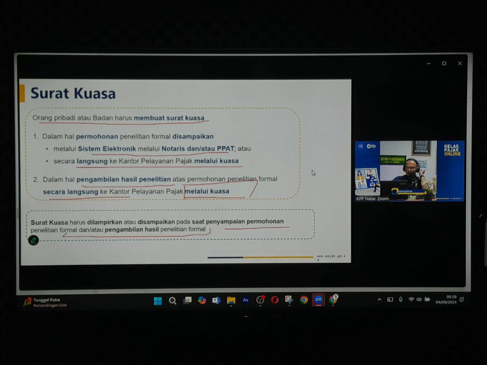 Kantor Pelayanan Pajak (KPP) Pratama Natar menyelenggarakan Kelas Pajak Electronic Pengalihan Hak atas Tanah dan Bangunan (e-PHTB) Notaris/Pejabat Pembuat Akta Tanah (PPAT) kepada Notaris dan PPAT di Kabupaten Lampung Selatan, Pesawaran, Pringsewu, dan Tanggamus. Kelas pajak ini diselenggaakan secara daring melalui platform Zoom dari Ruang Podcast KPP Pratama Natar, Lampung Selatan (Rabu, 4/9).