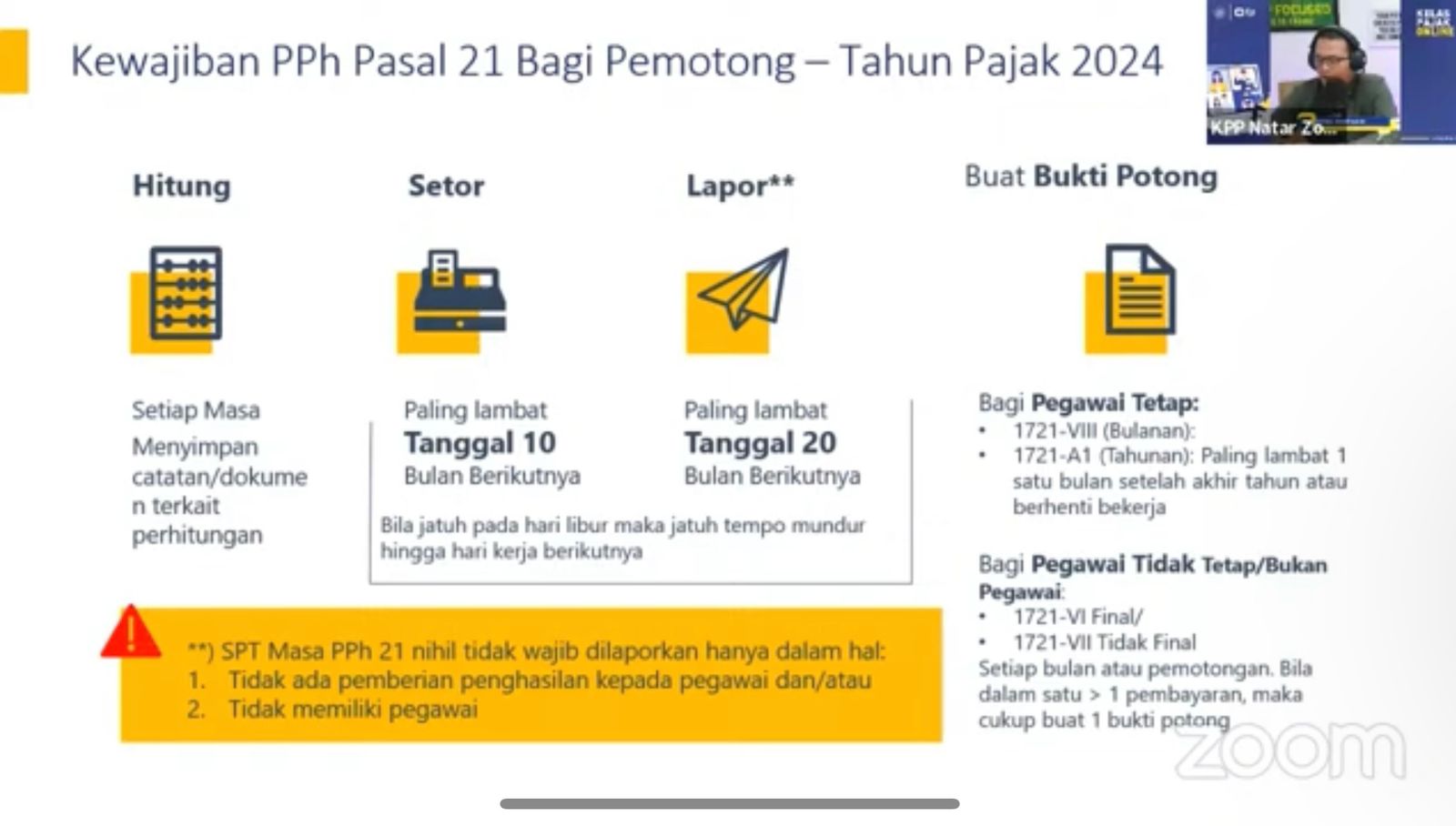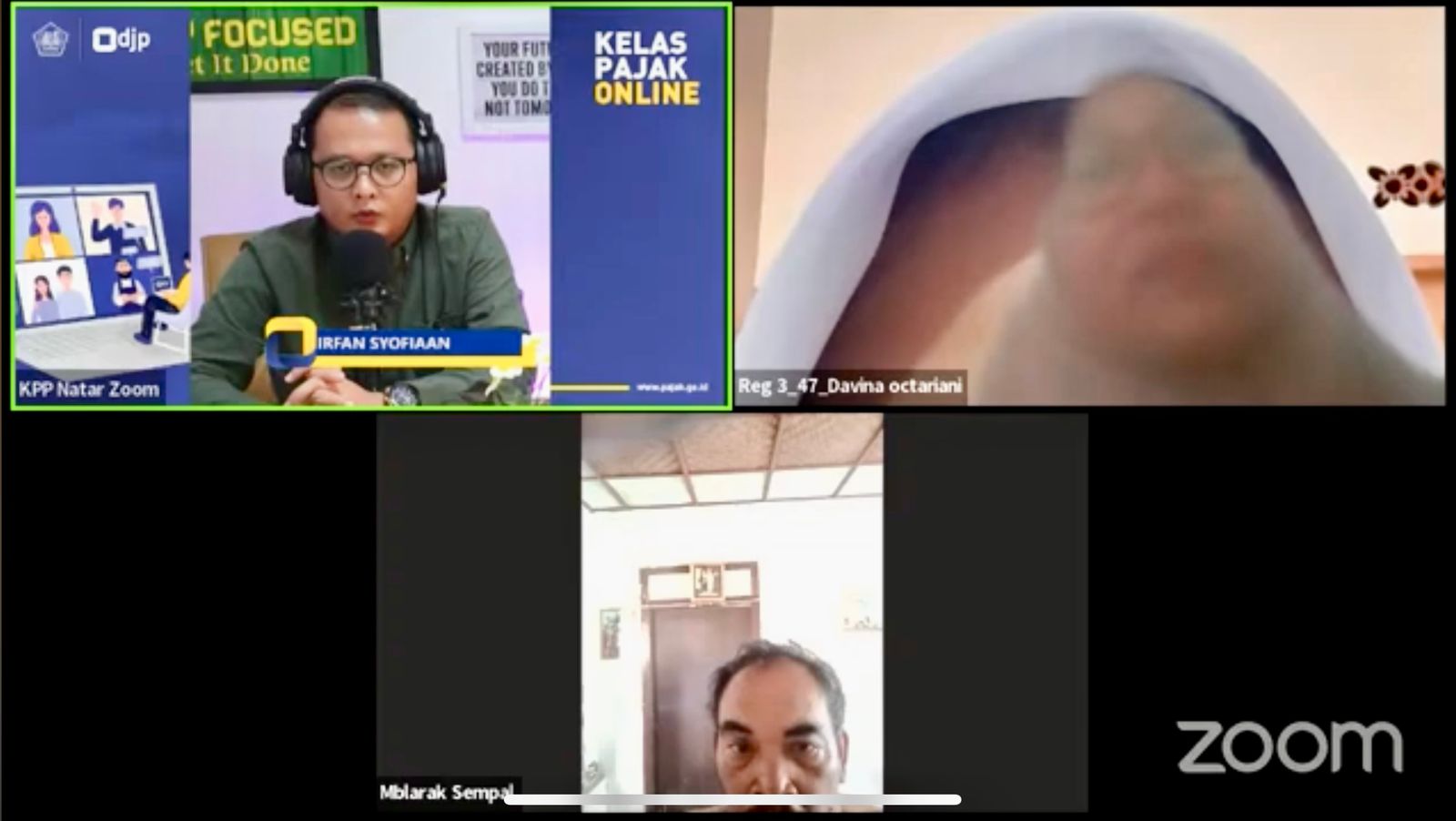Dalam rangka meningkatkan pemahaman penghitungan Pajak Penghasilan (PPh) terbaru, Kantor Pelayanan Pajak (KPP) Pratama Natar menggelar kelas pajak online Tarif Efektif Rata-Rata (TER) PPh Pasal 21 melalui Zoom Meeting yang dipandu oleh Dimitra Prima Putri. Kegiatan ini dimulai pukul 09.00 hingga 11.30 WIB (Kamis, 29/8). Adapun pemateri kelas pajak TER PPh pasal 21 ini disampaikan oleh Irfan Syofiaan.