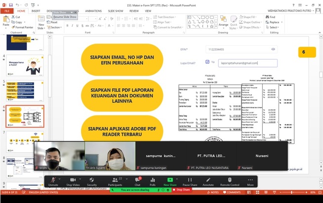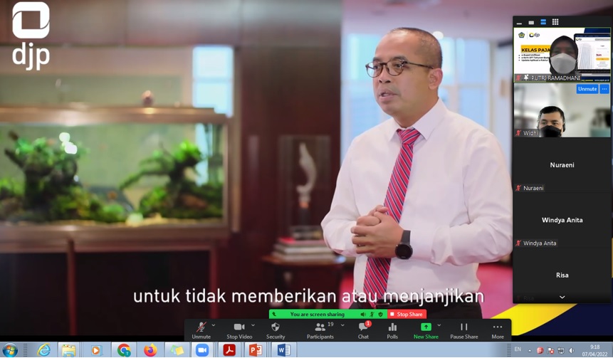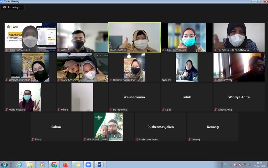 Kantor Pelayanan Pajak (KPP) Pratama Pati mengadakan kelas pajak secara daring melalui aplikasi Zoom Meeting dengan tema bahasan e-Bupot Unifikasi, e-Form Surat Pemberitahuan (SPT) Tahunan Badan dan Update e-Faktur di Pati (Kamis, 07/04).