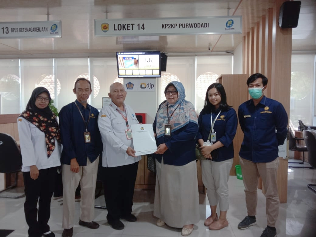 Kantor Wilayah Direktorat Jenderal Pajak (Kanwil DJP) Jawa Tengah I yang diwakili oleh Kepala Seksi Kerja Sama dan Hubungan Masyarakat Dyah Sri Rejeki bersama Achmad Soleh selaku Kepala Kantor Pelayanan, Penyuluhan, dan Konsultasi Perpajakan (KP2KP) Purwodadi melaksanakan penyerahan Nota Kesepakatan Penyelenggaraan Mal Pelayanan Publik (MPP) Kabupaten Grobogan di Gedung MPP Grobogan (Rabu, 5/4).