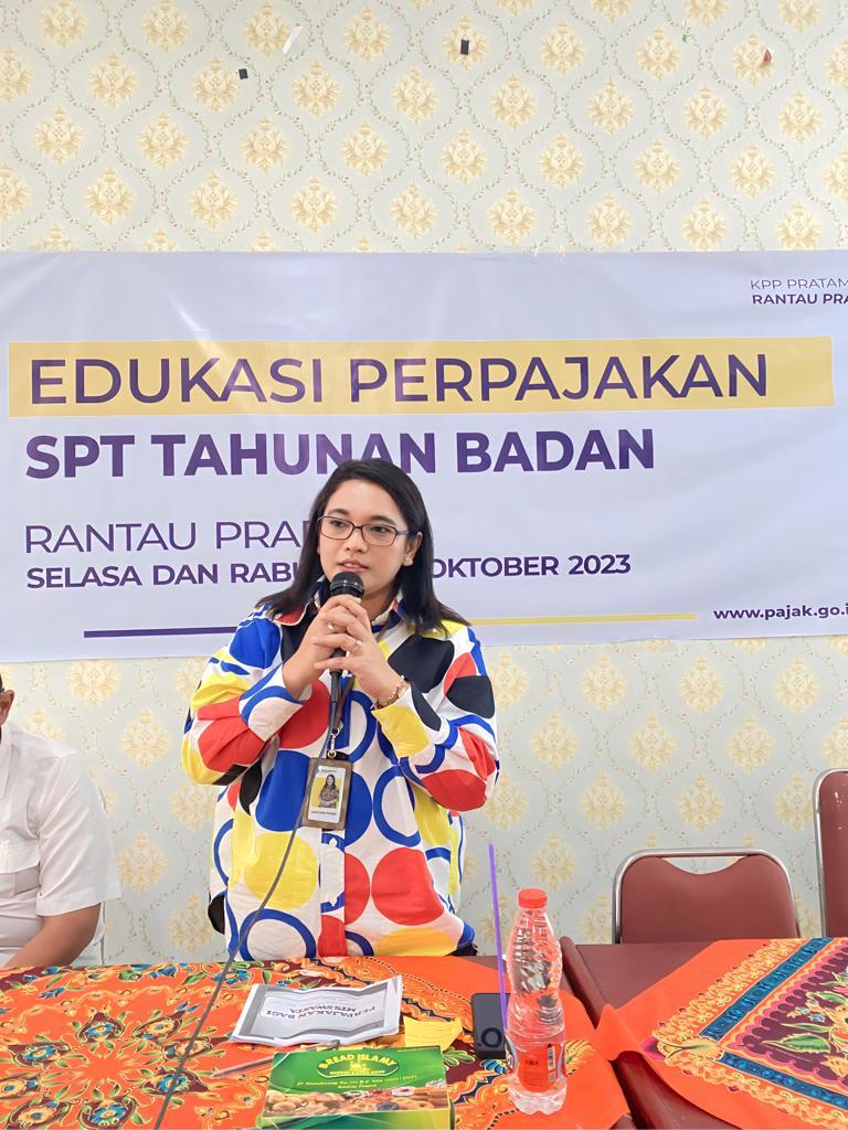 Kantor Pelayanan Pajak Pratama Rantau Prapat (Pajak Rantau Prapat) mengadakan edukasi kewajiban perpajakan pelaporan SPT Tahunan Badan kepada instansi pendidikan swasta di lingkungan Kantor Kementerian Agama Labuhanbatu di Aula Kantor Kementerian Agama Kab. Labuhanbatu, Sumatera Utara (Selasa, 24/10). Kegiatan ini bertujuan untuk mengingatkan kembali serta meningkatan pemahaman tentang tata cara pelaksanaan kewajiban pelaporan SPT Tahunan Badan.