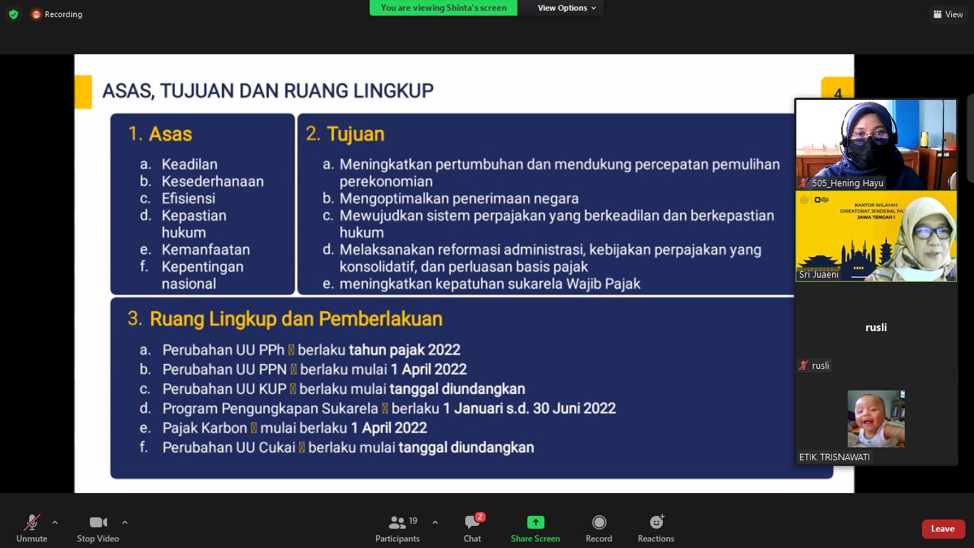 Kantor Pelayanan Pajak (KPP) Pratama Salatiga bersama dengan Kantor Wilayah Direktorat Jenderal Pajak (Kanwil DJP) Jawa Tengah I melakukan sosialisasi Undang-Undang Harmonisasi Peraturan Perpajakan (UU HPP) serta implementasi fitur prepopulated dokumen Pemberitahuan Ekspor Barang (PEB) dan CK-1 dilakukan secara daring melalui aplikasi Zoom Meeting di Salatiga(Jum’at, 26/11).