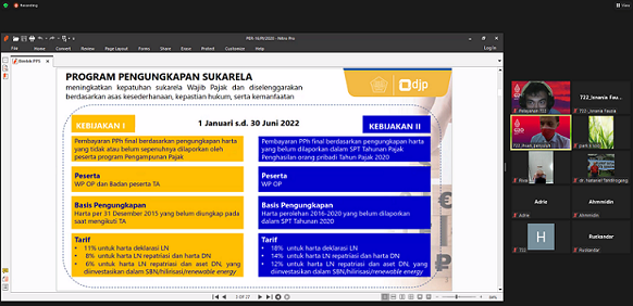 Kantor Pelayanan Pajak (KPP) Pratama Samarinda Ilir menggelar kelas pajak dengan tema Program Pengungkapan Sukarela (PPS) melalui aplikasi Zoom Meeting, di studio ruang Harmoni (Rabu,16/3). Kelas pajak PPS dimulai pukul 14.00 WITA sampai dengan selesai. Peserta kelas pajak merupakan Wajib Pajak di wilayah KPP Pratama Samarinda Ilir.