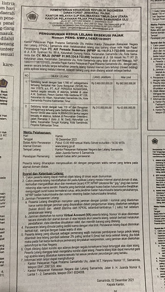 Kantor Pelayanan Pajak (KPP) Pratama Samarinda Ulu mengumumkan lelang aset sitaan pajak melalui surat kabar/koran Kaltim Post di Kota Samarinda (Kamis, 2/12).