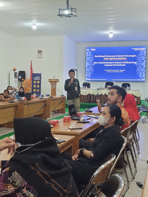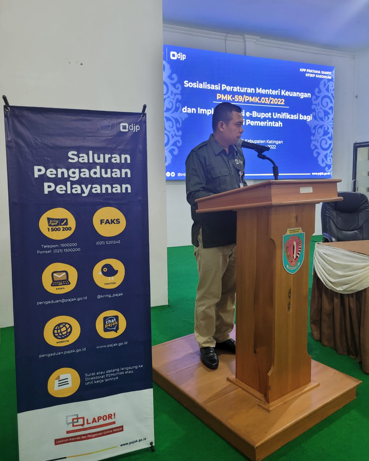 KPP Pratama Sampit dan KP2KP Kasongan, dengan dukungan penuh dari Sekretariat Daerah dan Badan Pengelola Keuangan dan Aset Daerah (BPKAD) Kabupaten Katingan, melaksanakan Sosialisasi Peraturan Menteri Keuangan Nomor 59/PMK.03/2022 dan Implementasi e-Bupot Unifikasi bagi Instansi Pemerintah di Aula BPKAD Kabupaten Katingan (Kamis, 24/11).
