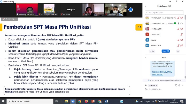 Kegiatan ini diadakan secara online dengan menggunakan media aplikasi Zoom Meeting pada hari Kamis tanggal 21 April 2022 yang dimulai pukul 09.00 WIB sampai dengan pukul 11.00 WIB. Dengan diadakannya kelas pajak ini, maka Wajib Pajak Badan akan dapat memahami latar belakang dan tata cara melaporkan SPT Masa Unifikasi yang wajib dilakukan oleh Wajib Pajak mulai masa pajak April 2022.