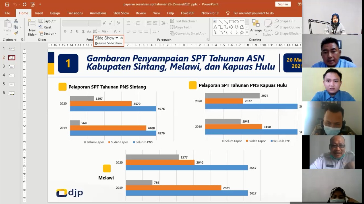 "Per tanggal 20 Maret 2021 ASN di wilayah Kabupaten Melawi yang sudah melakukan pelaporan SPT Tahunan sebanyak 2.040 ASN, belum melakukan pelaporan sebanyak 1.577 dan total adalah 3.617 ASN terdaftar. Angka belum melaporkan SPT ini meningkat dari tahun sebelumnya yang hanya sebanyak 786 ASN. Untuk itu kami di sini mengadakan acara bimtek agar membantu Bapak/Ibu yang mengalami kesulitan pelaporan SPT Tahunannya dapat mendapatkan solusi," ujar Kepala Kantor Pelayanan, Penyuluhan dan Konsultasi Perpajakan (KP2KP) Nanga Pinoh Dedy Agus Prabowo dalam acara Bimbingan Teknis (Bimtek) Pengisian Surat Pemberitahuan (SPT) Tahunan Pajak Penghasilan (PPh) Orang Pribadi secara daring melalui Zoom Meeting di Aula KPP Pratama Sintang, Sintang (Rabu, 24/3).