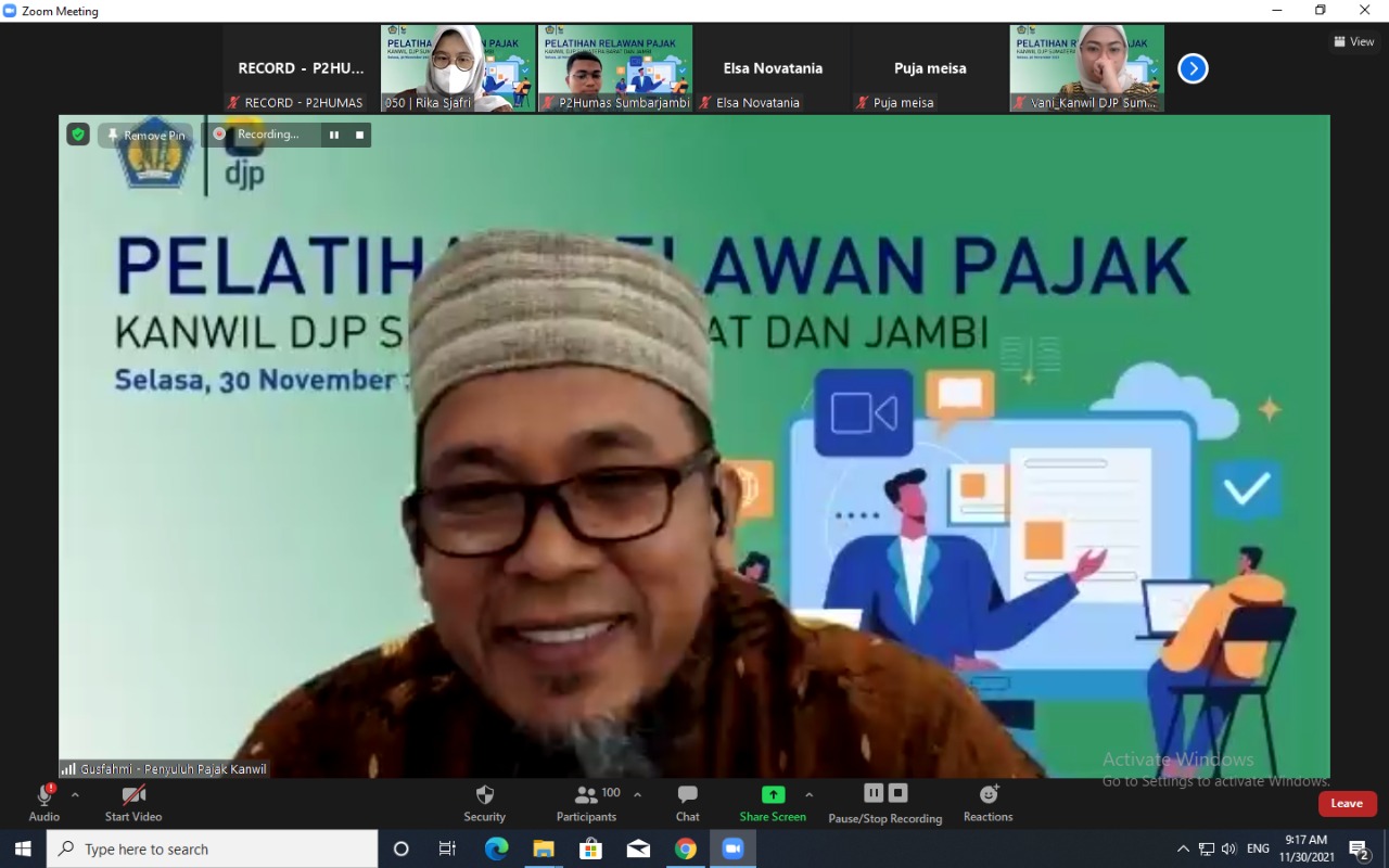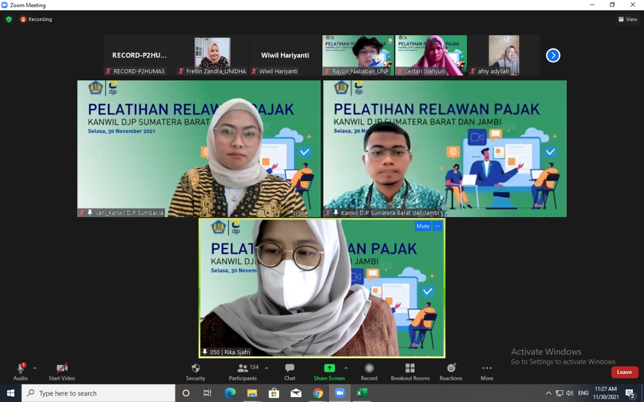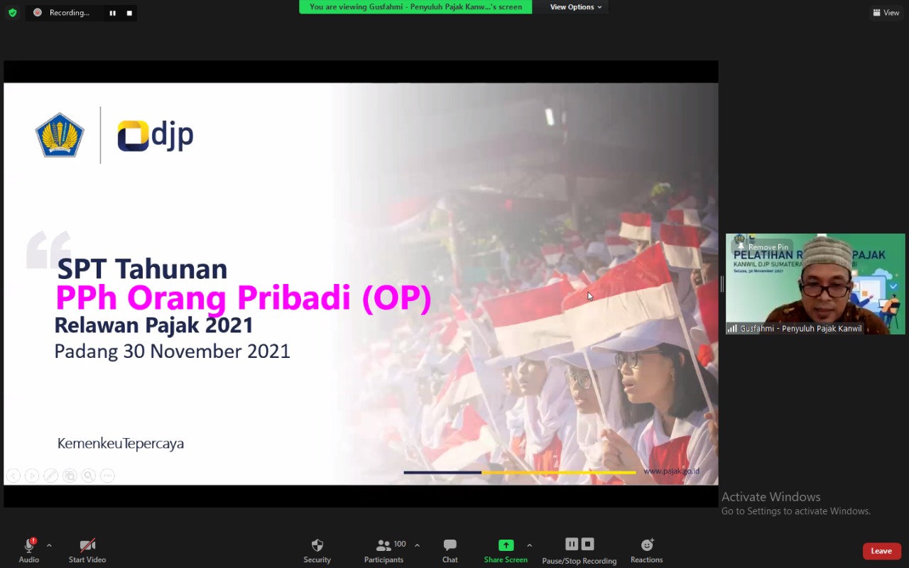 Kantor Wilayah Direktorat Jenderal Pajak (Kanwil DJP) Sumatera Barat dan Jambi memberikan edukasi perpajakan berupa pelatihan bagi relawan pajak di wilayah Sumatera Barat dan Jambi secara daring di Padang, Sumatera Barat (Selasa, 30/11). Tujuan kegiatan ini untuk mengoptimalisaskan peran relawan pajak di lingkungan Kanwil DJP Sumatera Barat dan Jambi.