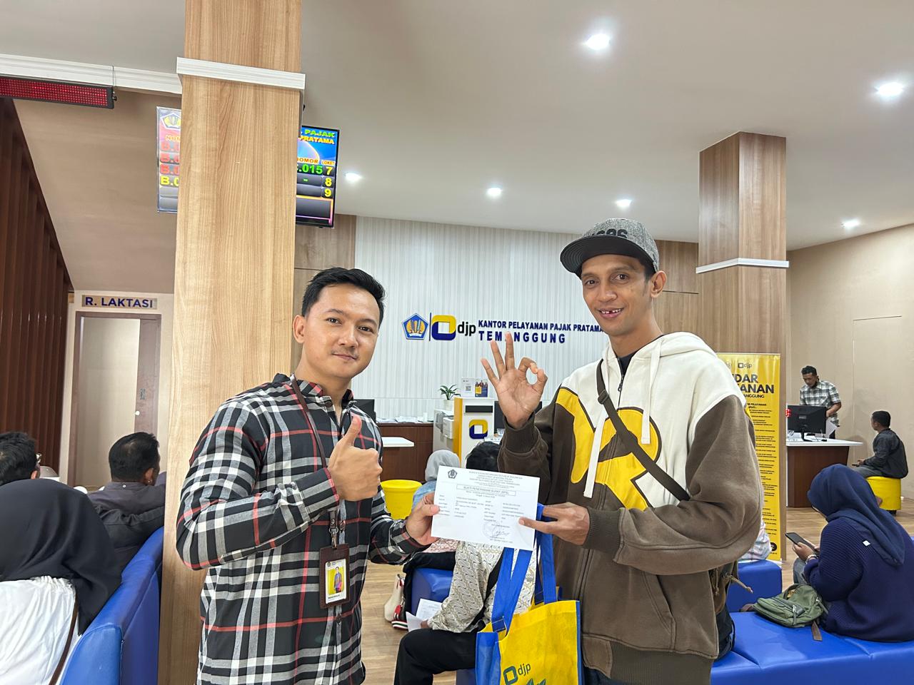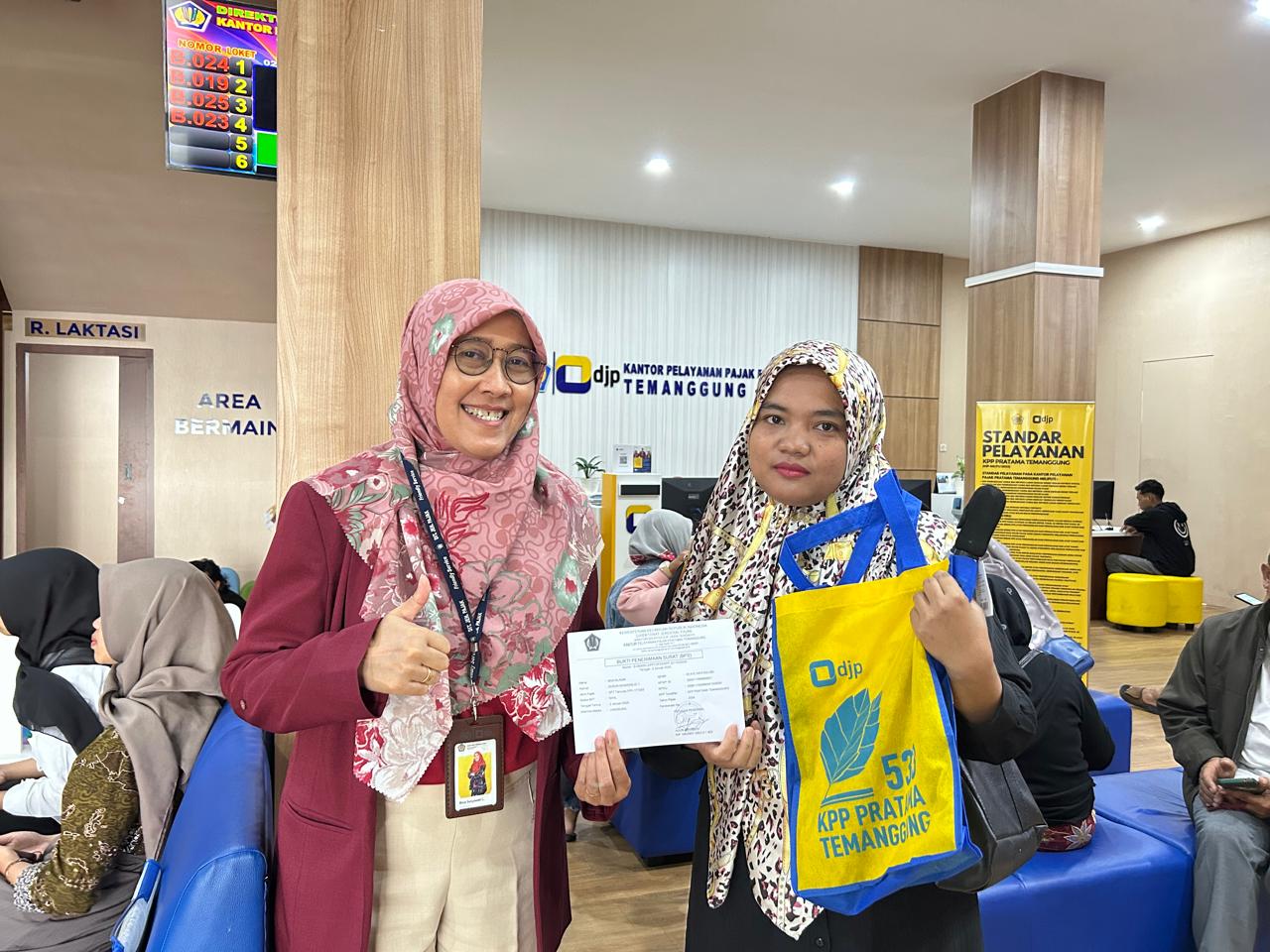 Kantor Pelayanan Pajak (KPP) Pratama Temanggung memberikan apresiasi kepada 5 (lima) wajib pajak yang melaporkan Surat Pemberitahuan (SPT) Tahunan 2024 paling awal pada hari pertama di bulan Januari tahun 2025 (Kamis, 2/1). Kepala Seksi Pelayanan, Rina Setyawati Lestari memberikan secara langsung souvenir kepada wajib pajak yang datang dan lapor SPT Tahunan di loket Tempat Pelayanan Terpadu (TPT) KPP Pratama Temanggung. Pemberian souvenir merupakan salah satu bentuk apresiasi kepada wajib pajak atas kesadarannya dalam melaporkan SPT Tahunan lebih awal daripada wajib pajak lainnya.