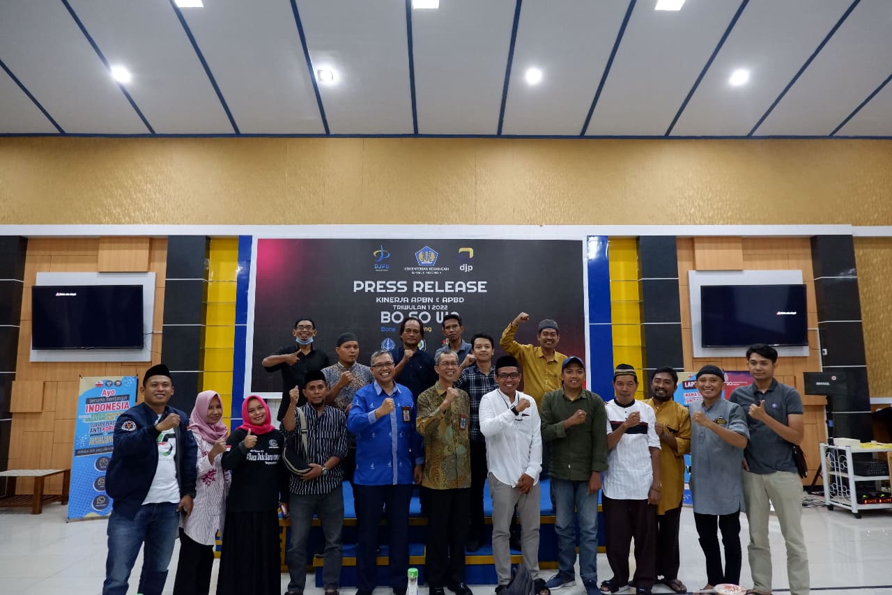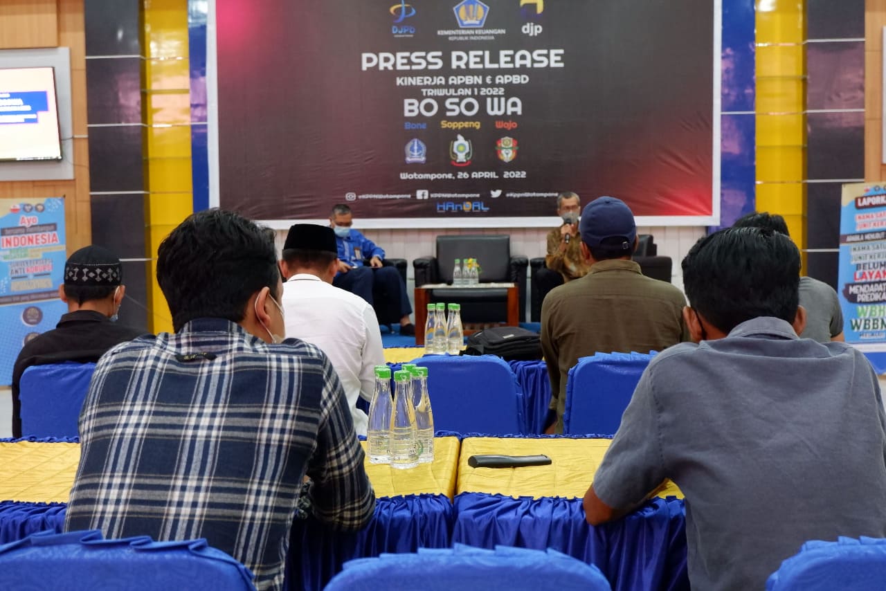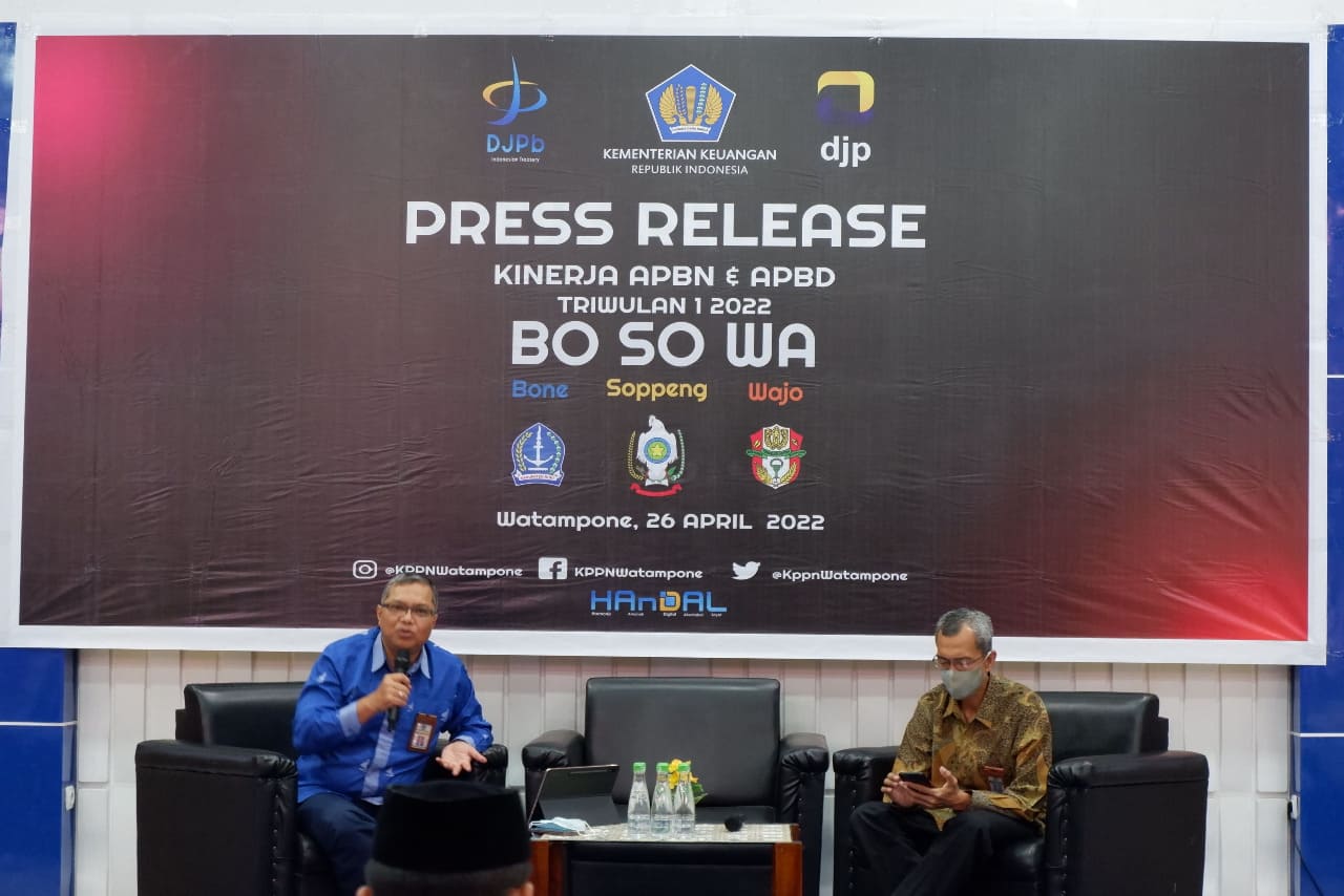 Kantor Pelayanan Pajak (KPP) Pratama Watampone dan Kantor Pelayanan Perbendaharaan Negara (KPPN) Watampone melakukan jumpa pers terkait kinerja APBN dan APBD triwulan I 2022 di wilayah Bone, Soppeng, dan Wajo yang berlokasi di aula KPPN Watampone, Kabupaten Bone (Selasa, 26/04).