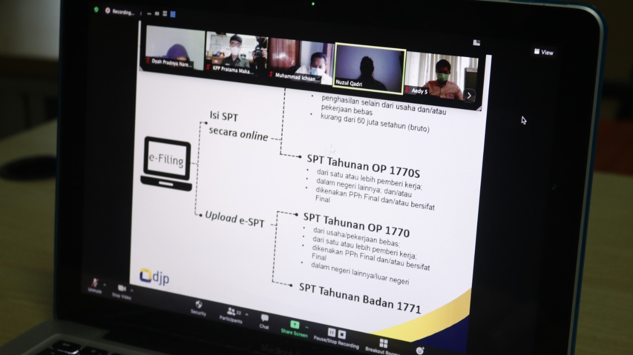 Kantor Pelayanan Pajak (KPP) Pratama Makassar Utara melaksanakan kelas pajak secara daring melalui aplikasi telekonferensi Zoom Cloud Meeting dengan tema Bimbingan Teknis Pengisian SPT Tahunan PPh Orang Pribadi di Makassar (Kamis, 4/3). Kelas Pajak merupakan program tahunan yang rutin diadakan KPP Pratama Makassar Utara.