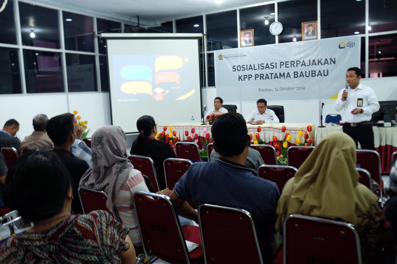 Kantor Pelayanan Pajak (KPP) Pratama Baubau melaksanakan Sosialisasi PP 23 Tahun 2018 tentang Pajak Penghasilan atas Penghasilan dari Usaha yang Diterima atau Diperoleh Wajib Pajak yang Memiliki Peredaran Bruto Tertentu (Senin, 14/10). Kegiatan yang diikuti oleh 50 orang pelaku Usaha Mikro Kecil dan Menengah (UMKM) se-Kota Baubau ini diadakan di Aula Lantai 2 KPP Pratama Baubau.