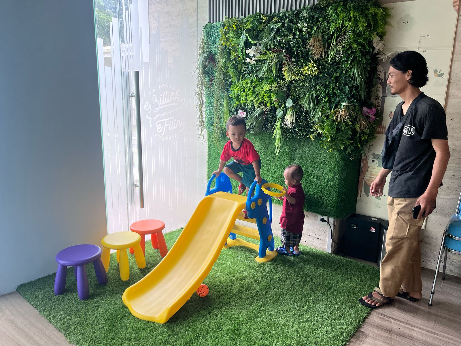 KPP Madya Tangerang menyediakan area bermain berupa perosotan, kursi anak, pengukur tinggi badan anak, dan bola kecil sebagai bentuk pelayanan prima kepada wajib pajak.