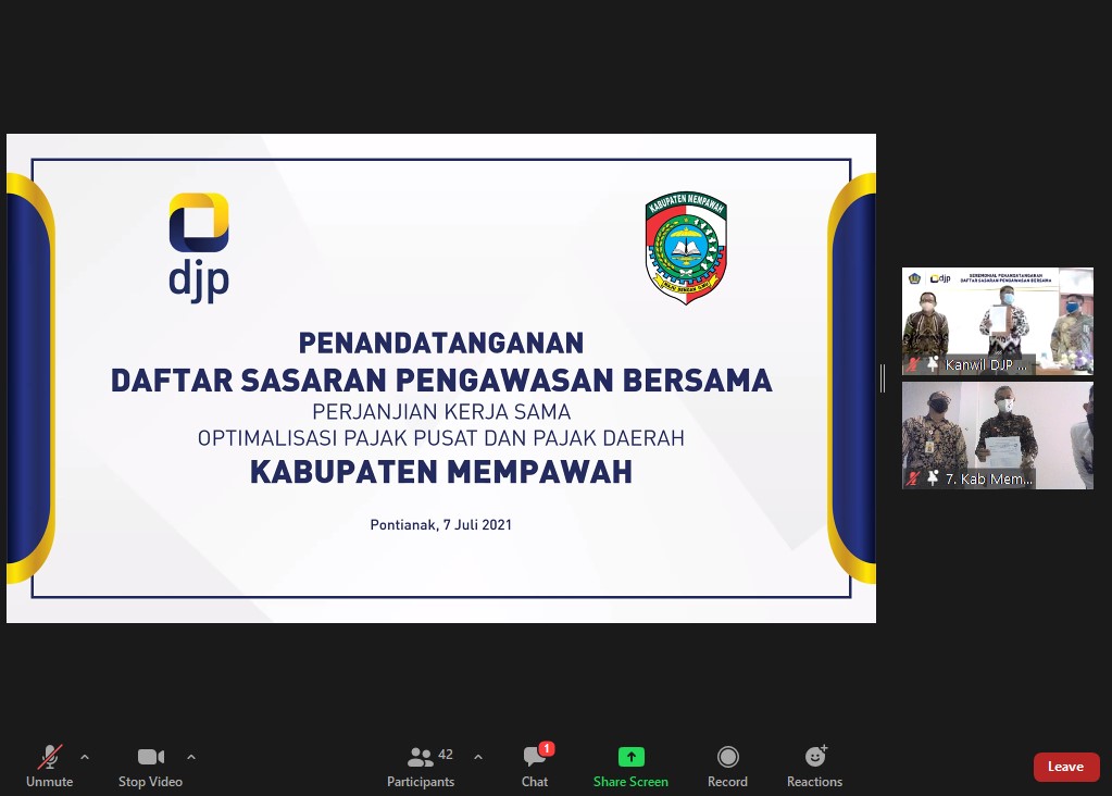 Kantor Pelayanan, Penyuluhan, dan Konsultasi Perpajakan (KP2KP) Mempawah bersama dengan Pemerintah Daerah Kabupaten Mempawah mengikuti acara Seremoni Penandatanganan Daftar Sasaran Pengawasan Bersama (DSPB) terkait Perjanjian Kerja Sama (PKS) Optimalisasi Pajak Pusat dan Pajak Daerah di Pontianak (Rabu, 7/7).