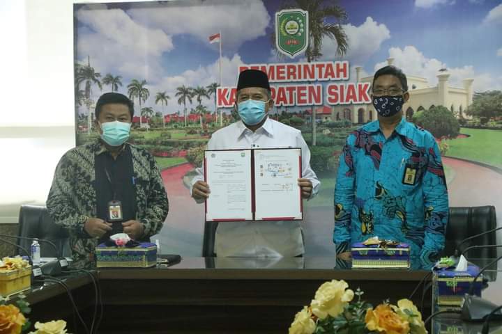 Bupati Kabupaten Siak Alfedri mewakili Pemerintah Daerah Kabupaten Siak bersama dengan Direktorat Jenderal Pajak (DJP), serta Direktorat Jenderal Perimbangan Keuangan (DJPK) Kementerian Keuangan, melakukan penandatanganan perjanjian kerja sama (PKS) terkait optimalisasi pemungutan pajak pusat dan pajak daerah tahun 2021 secara virtual di masing-masing lokasi dan untuk Pemkab Siak, dilaksanakan di Ruang Rapat Pucuk Rebung, Kantor Bupati Siak (Rabu 21/4).