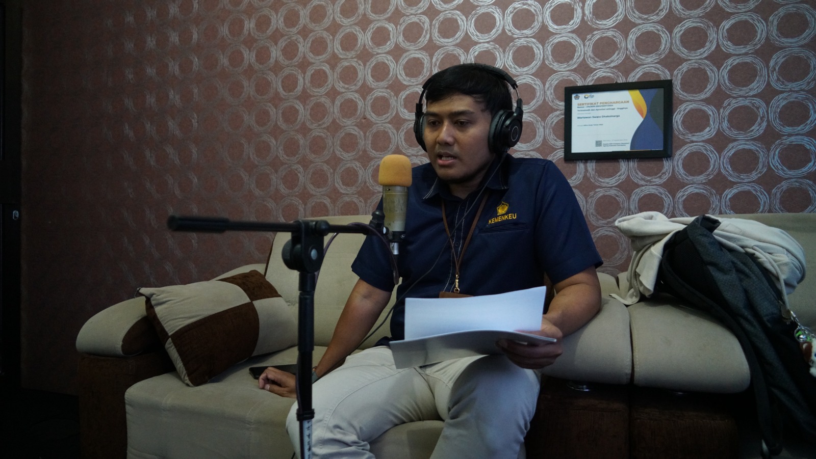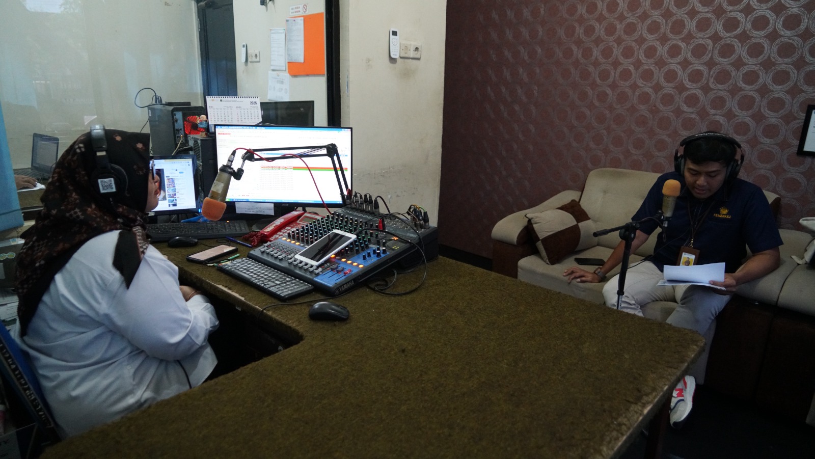 Penyuluh Kantor Pelayanan Pajak (KPP) Pratama Wonosari, Dior Panji Putra Negara, memberikan sosialisasi tentang pengalihan tanah dan bangunan melalui siaran radio di Ruang Penyiaran Radio Swara Dhaksinarga, Jalan Melati, Purbosari, Wonosari, Kabupaten Gunungkidul (Rabu, 18/6).