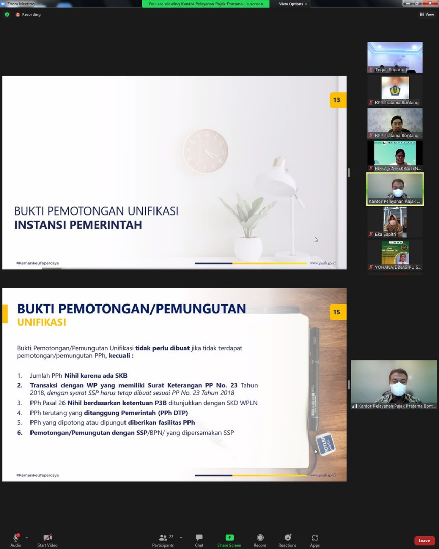 Kantor Pelayanan Pajak (KPP) Pratama Bontang kembali menyelenggarakan kelas pajak dengan tema “Bimtek Implementasi Surat Pemberitahuan (SPT) Unifikasi bagi Instansi Pemerintah” secara daring di Kota Bontang (Selasa, 2/11). Kegiatan ini dimulai pukul 09.00 WITA sampai dengan 11.00 WITA.
