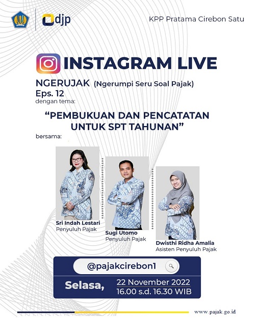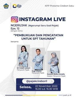 Tim Penyuluh KPP Pratama Cirebon Satu yang terdiri dari Sri Indah Lestari, Sugi Utomo, dan Dwisthi Ridha Amalia melaksanakan penyuluhan melalui live Instagram pada akun @pajakcirebon1 di Cirebon (Selasa, 22/11). Penyuluhan bertajuk Ngerumpi Seru Soal Pajak (Ngerujak) pada episode ke-12 ini membahas tentang pencatatan dan pembukuan untuk perispan pembuatan SPT Tahunan Tahun Pajak 2022.