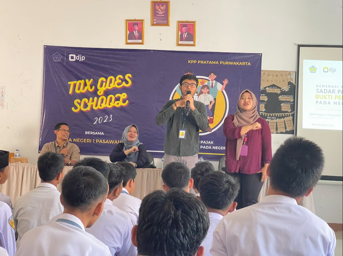 Kantor Pelayanan Pajak (KPP) Purwakarta menggelar kegiatan Tax Goes to School (TGTS) di aula Sekolah Menengah Atas (SMA) Negeri 1 Pasawahan, Jalan Kapten Halim No.1, Pasawahan, Kabupaten Purwakarta (Selasa, 5/9).