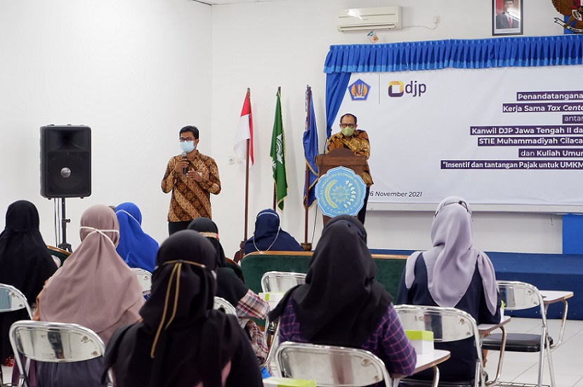 Muhammad Najib Amrullah, penyuluh pajak dari Kantor Pelayanan Pajak Pratama Cilacap memberikan edukasi perpajakan kepada mahasiswa STIE Muhammadiyah Cilacap (Selasa, 16/11). Ia menjelaskan terkait kewajiban ber-NPWP (Nomor Pokok Wajib Pajak) serta tata cara pembayaran pajak kepada puluhan mahasiswa yang hadir dalam acara penandatangan kerja sama Tax Center dan kuliah umum.
