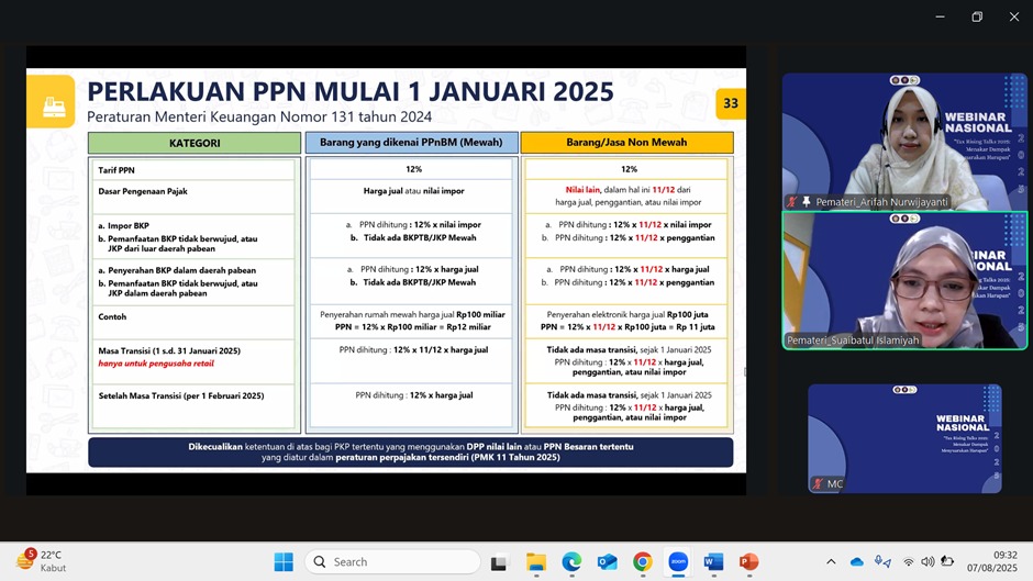 “Langkah ini bertujuan menjaga daya beli masyarakat dan kestabilan perekonomian nasional,” ujar Arifah pada Webinar Nasional bertema “Tax Rising Talks 2025 yang digelar oleh Politeknik Negeri Malang Program Studi di Luar Kampus Utama Kota Kediri melalui aplikasi Zoom Meeting (Kamis, 7/8).