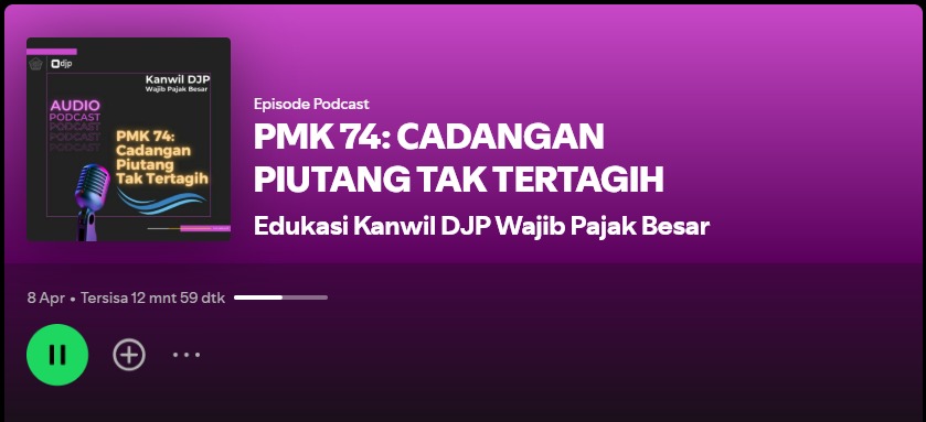 Podcast ini dapat diakses secara gratis di Spotify dan akan terus diperbarui secara berkala sebagai bagian dari komitmen Kanwil DJP Wajib Pajak Besar dalam memperkuat komunikasi dan pelayanan informasi perpajakan.