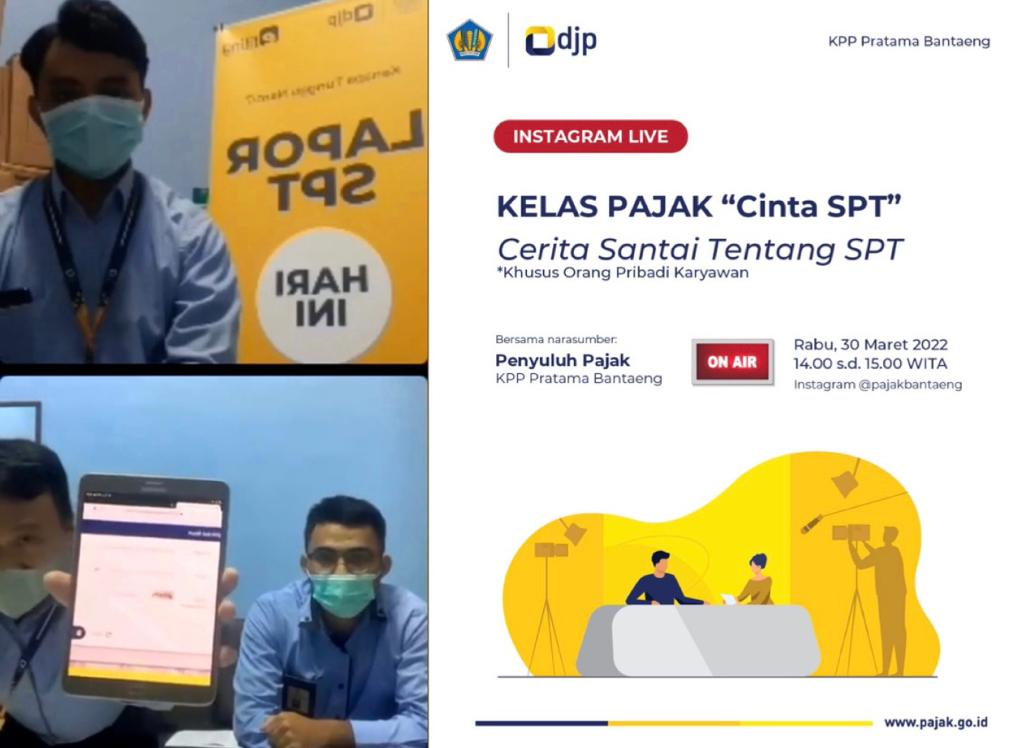 Kantor Pelayanan Pajak (KPP) Pratama Bantaeng melaksanakan kegiatan edukasi perpajakan tentang pelaporan Surat Pemberitahuan (SPT) Tahunan Pajak Penghasilan Orang Pribadi (PPh OP) khusus untuk karyawan bertema Cinta SPT (Cerita santai tentang SPT) melalui fitur live pada aplikasi Instagram (Rabu, 30/3). Tim penyuluh pajak KPP Pratama Bantaeng memandu langsung jalannya acara dari ruang penyuluhan KPP Pratama Bantaeng, Kabupaten Bantaeng.
