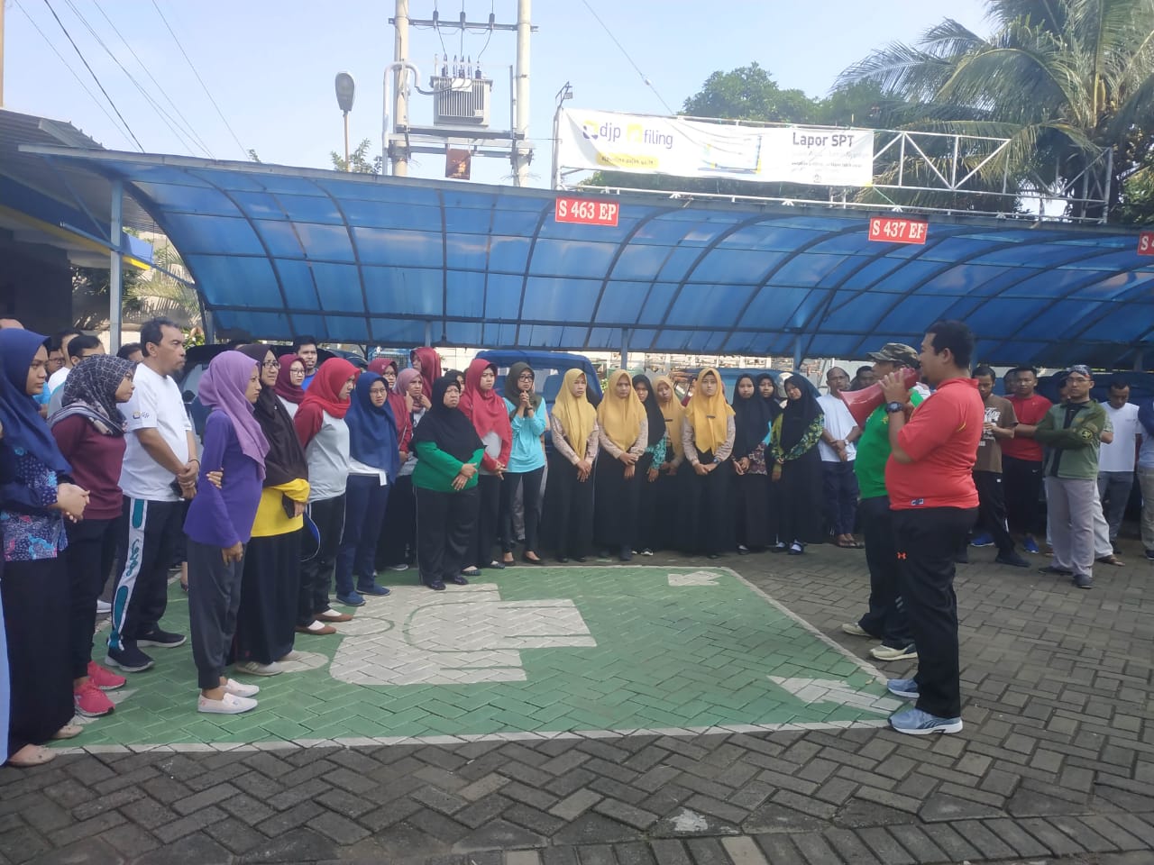 Dimulai dengan berkumpul di depan halaman Kantor KPP Pratama Tuban, semua pegawai mulai berbaris rapi. Dilanjutkan dengan kegiatan pemanasan yang bertujuan agar badan menjadi rileks. Kepala KPP Pratama Tuban, Eko Radnadi Susetio dalam sambutannya mengatakan sosialisasi dan simulasi ini untuk memberikan pengetahuan kepada seluruh pegawai agar jika terjadi bencana, mereka bisa menghadapinya. Walaupun Kabupaten Tuban sampai saat ini masih aman dari bencana, tetapi semua itu kembali lagi kepada kuasa Allah.