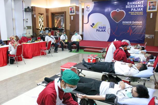Bekerja sama dengan PMI Pontianak, Kanwil DJP Kalimantan Barat menyelenggarakan kegiatan donor darah di Aula Kanwil DJP Kalimantan Barat, Pontianak (Senin, 13/7). Kepala Kanwil DJP Kalbar Ahmad Djamhari ikut mendonorkan darahnya diikuti oleh 57 pegawai di lingkungan Kementerian Keuangan Kalimantan Barat.