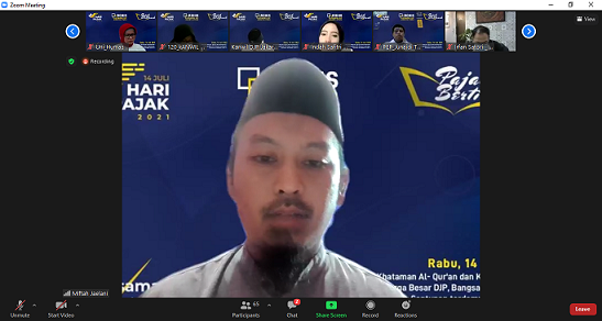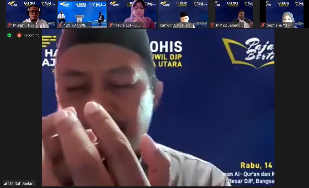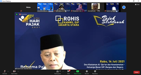 Kegiatan Pajak Bertilawah dan khataman Al-Qur'an dilaksanakan pegawai Kanwil DJP Jakarta Utara melalui media Zoom Meeting mulai pukul 11.00 WIB. Kegiatan disertai doa keselamatan bangsa dan keluarga besar DJP dipimpin Ustaz Miftah Jaelani.