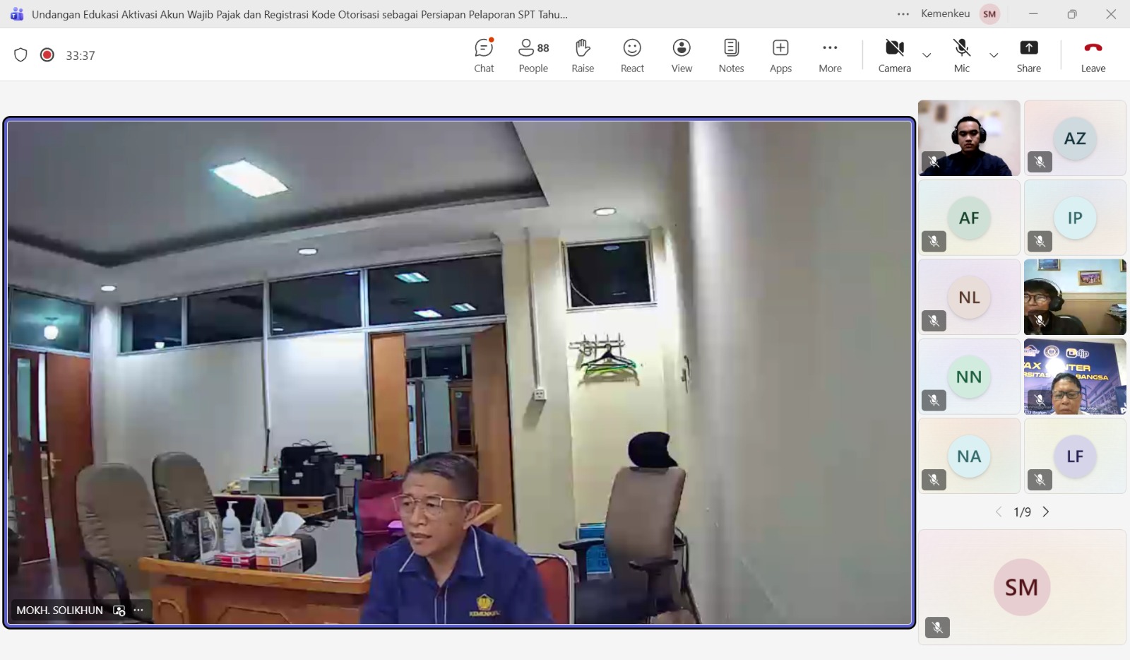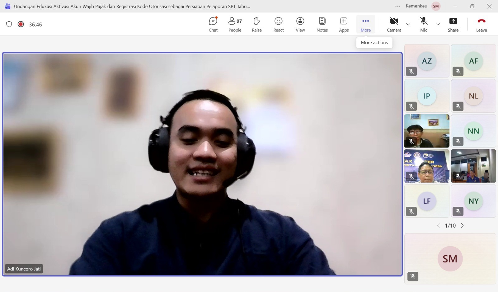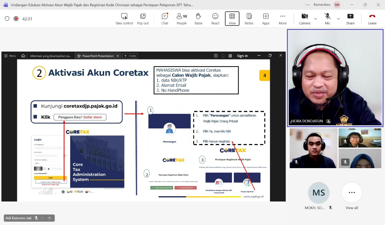 Kantor Wilayah (Kanwil) Direktorat Jenderal Pajak (DJP) Banten menggelar Sosialisasi Coretax DJP berkolaborasi dengan Relawan Pajak Negeri (RENJANI) seluruh tax center tiap perguruan tinggi di Banten secara daring melalui Microsoft Teams Meeting (Rabu, 26/11).