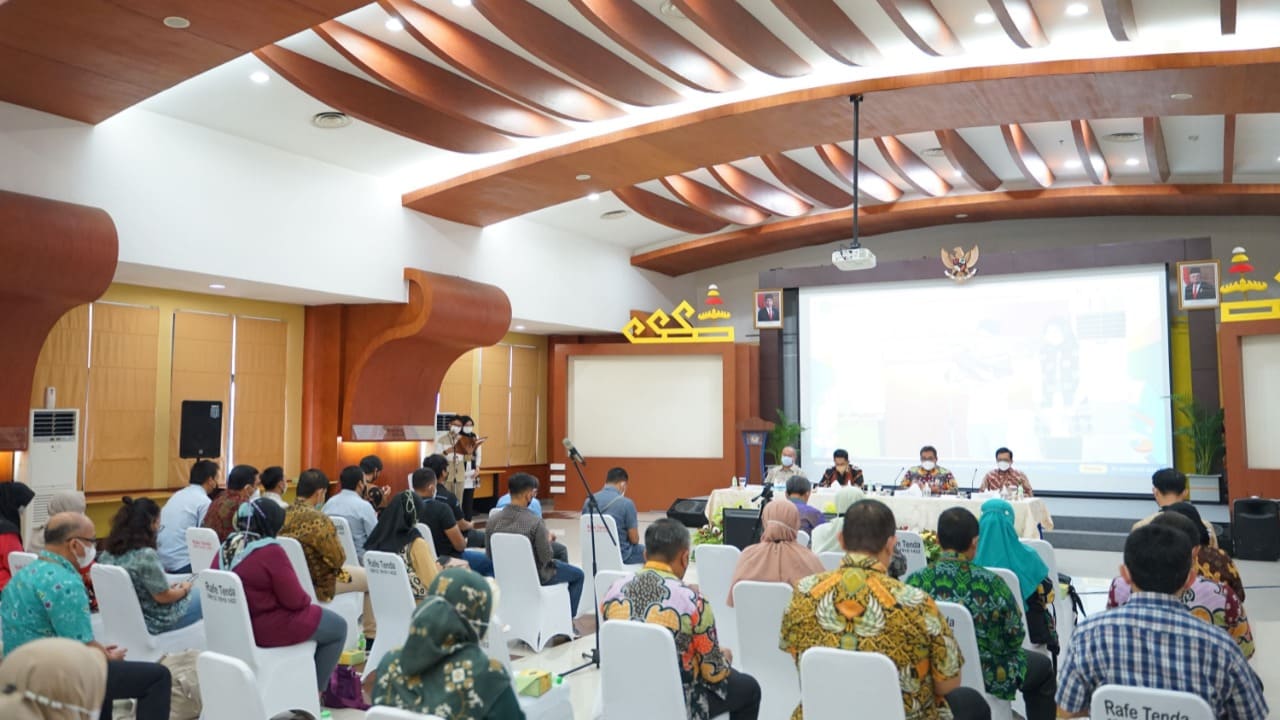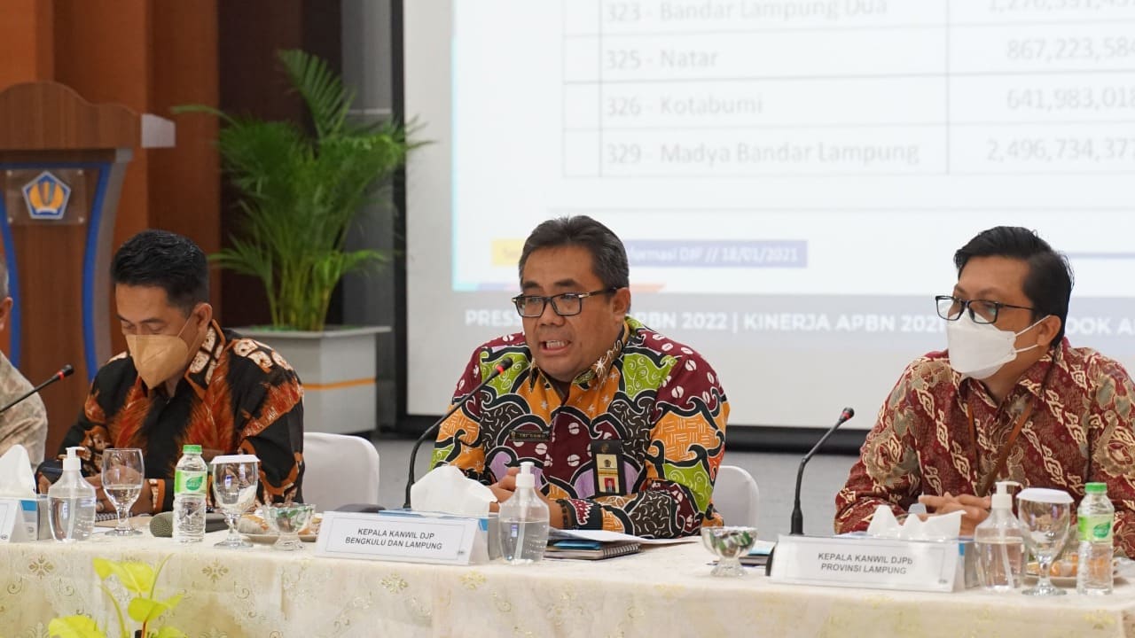 Perwakilan Kementerian Keuangan Provinsi Lampung menyelenggarakan Press Release Kinerja APBN 2021 dan Outlook APBN 2022 di Aula Rafflesiger Kanwil DJP Bengkulu dan Lampung, Kota Bandar Lampung (Kamis, 20/1).