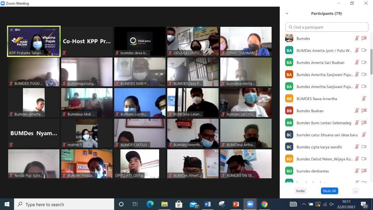 Kantor Pelayanan Pajak (KPP) Pratama Tabanan menggelar edukasi perpajakan secara daring (Kamis, 22/7). Edukasi kali ini menyasar Badan Usaha Milik Desa (BUMDes) se-Kabupaten Tabanan yang diikuti oleh 57 orang perwakilan Badan Usaha Milik Desa (BUMDes) di Kabupaten Tabanan. Kegiatan ini berlangsung secara daring di Aula KPP Pratama Tabanan, Kabupaten Tabanan, Bali.