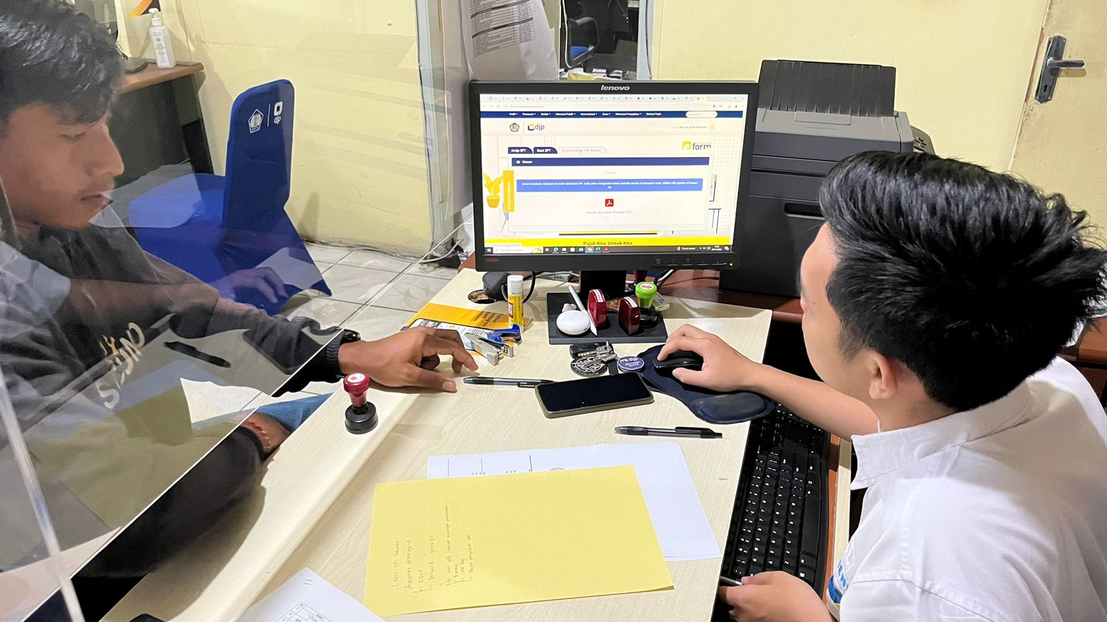 Membuka kunjungan, wajib pajak mengutarakan tujuan kedatangannya. “Pak, perusahaan saya sedang mengurus Surat Izin Usaha Jasa Konstruksi (SIUJK). Namun, permohonan saya tidak dapat diproses karena belum melaporkan SPT Tahunan Tahun 2023. Sebelumnya saya sudah aktivasi EFIN. Mohon bantuannya Pak untuk dipandu lapor SPT Tahunan secara online,” terang wajib pajak kepada petugas.