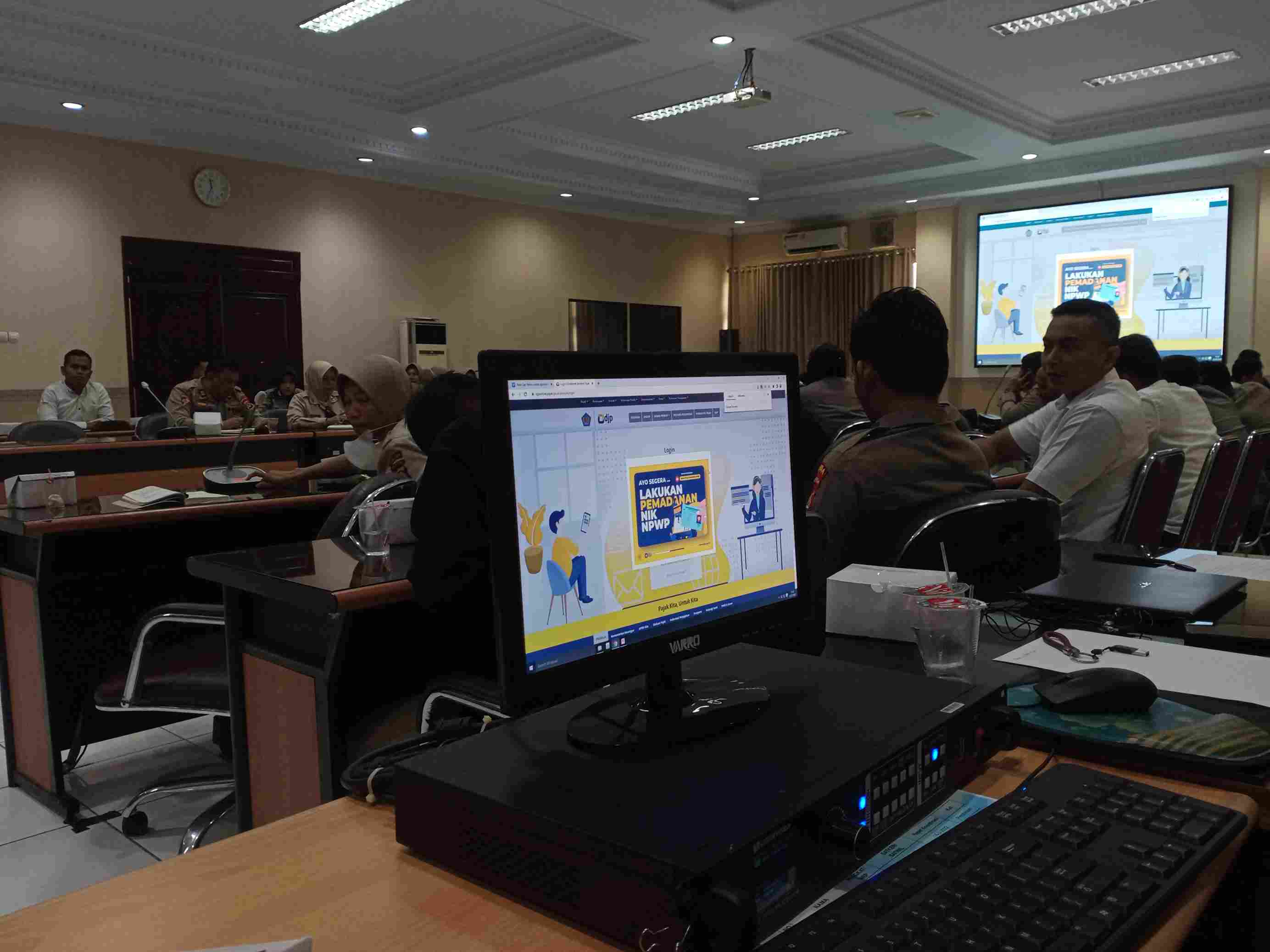 Bertempat di Ruang Rapat Utama (Rupatama) Polda Banten, Fungsional Penyuluh Pajak Slamet Riyanto memaparkan materi singkat mengenai Peraturan Menteri Keuangan Nomor PMK -112/PMK.03/2022 yang dilanjutkan dengan simulasi pemadanan Nomor Induk Kependudukan (NIK)-Nomor Pokok Wajib Pajak (NPWP) melalui DJP Online. Kegiatan ini juga diisi dengan penjelasan mengenai alur pelaporan Surat Pemberitahuan (SPT) Tahunan bagi Pegawai Bidkeu Polda Banten.