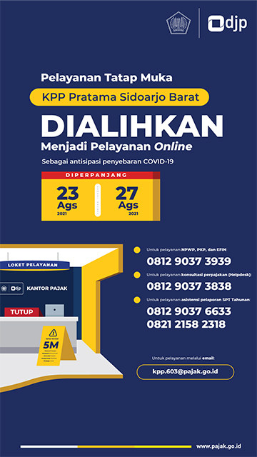 Kantor Pelayanan Pajak (KPP) Pratama Sidoarjo Barat memperpanjang jangka waktu penutupan pelayanan secara tatap muka sampai dengan 27 Agustus 2021 sebagai antisipasi penyebaran Covid-19. Informasi tersebut diumumkan melalui akun media sosial resmi KPP Pratama Sidoarjo Barat, Sidoarjo (Jumat, 20/8).