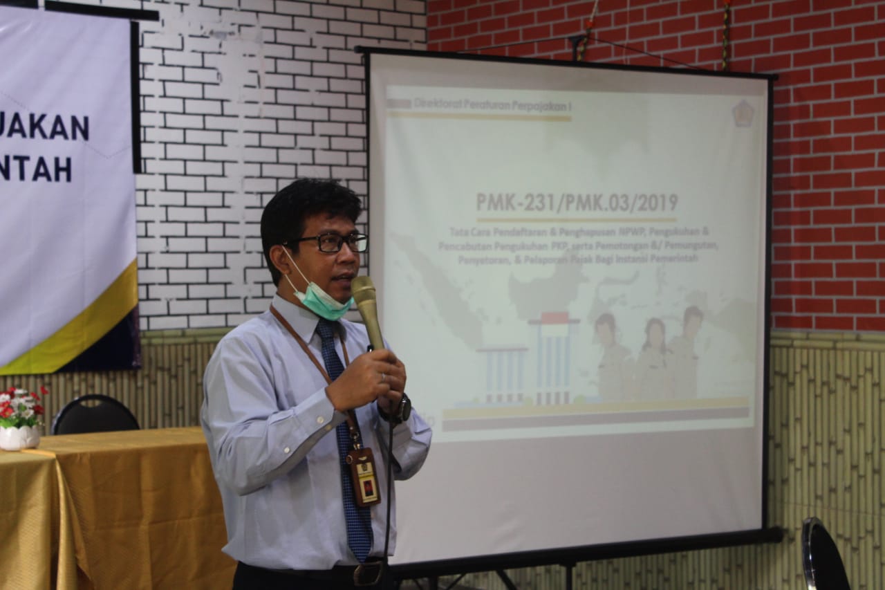 Muhammad Yusuf selaku narasumber dari KP2KP Sumenep memberikan penjelasan antara lain tentang kriteria penerbitan dan penghapusan Nomor Pokok Wajib Pajak (NPWP) bendahara secara jabatan oleh Direktorat Jenderal Pajak (DJP), cara melakukan pemungutan dan/atau penyetoran pajak, serta tata cara pelaporan pajak oleh bendahara instansi pemerintah.