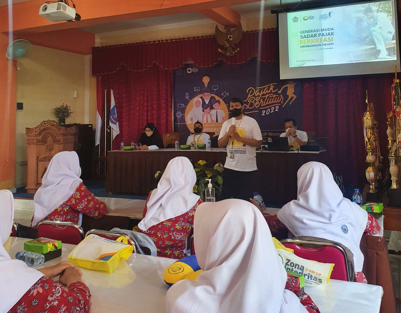 Puluhan siswa Sekolah Menengah Kejuruan (SMK) Negeri 1 Wonogiri mengikuti Pajak Bertutur 2022 yang diselenggarakan oleh Kantor Pelayanan, Penyuluhan, dan Konsultasi Perpajakan (KP2KP) Wonogiri di SMK Negeri 1 Wonogiri (Kamis, 18/8). Materi pajak bertutur disampaikan oleh Penyuluh Kantor Pelayanan Pajak (KPP) Pratama Sukoharjo dan pelaksana KP2KP Wonogiri.