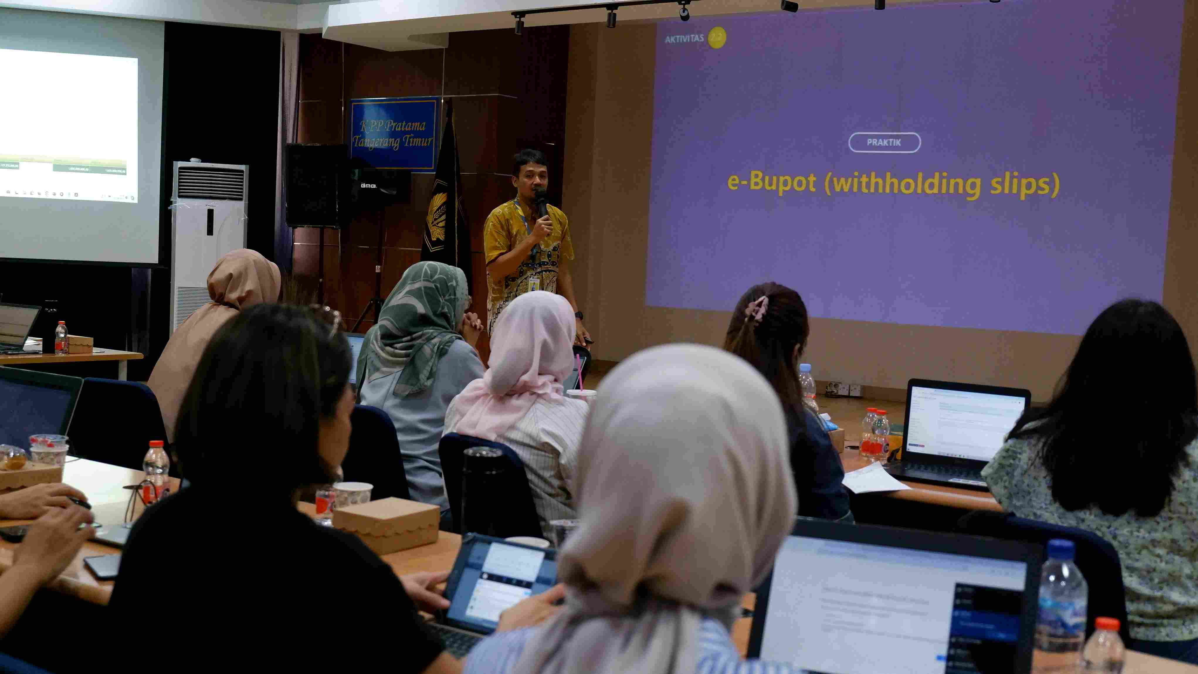 Fungsional Penyuluh Pajak Adiasta Puji Pratama, Amalia Insani, dan Siti Asiyah sebagai petugas asistensi bertugas mendampingi para wajib pajak yang terdiri dari 20 peserta pada setiap sesi untuk melaksanakan praktik pengenalan Sistem Inti Administrasi Perpajakan (SIAP) atau Coretax Administration System Direktorat Jenderal Pajak (DJP). Sementara itu, Rochmah dan Amalia Safitri bertugas pada sesi diskusi dan tanya jawab yang terdapat di tengah-tengah sesi dan di akhir sesi edukasi.