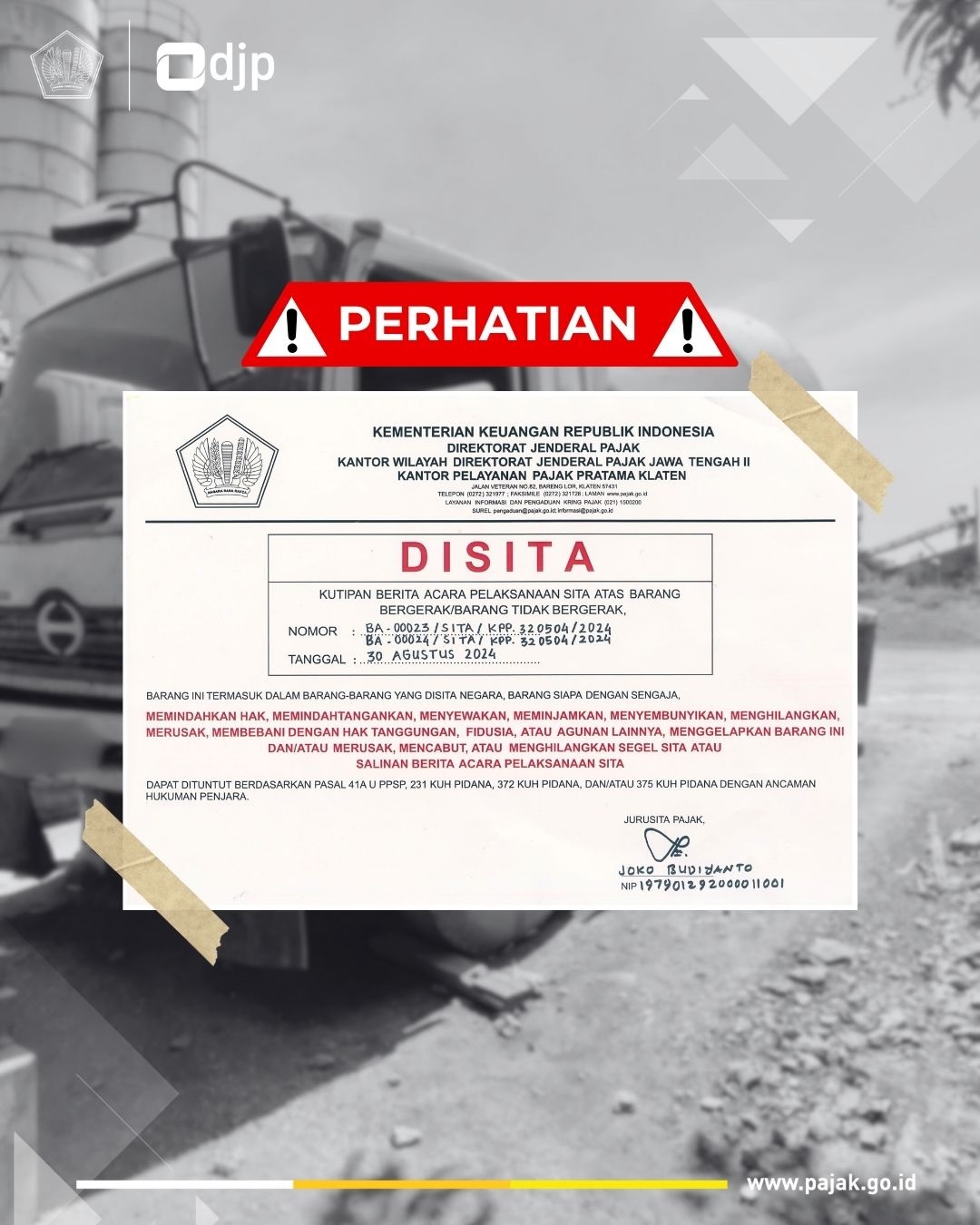 Kantor Pelayanan Pajak (KPP) Klaten melalui Juru Sita Pajak Negara (JSPN) melakukan tindakan penyitaan harta kekayaan penunggak pajak sebagai bagian dari Pekan Sita yang diinisiasi oleh Kantor Wilayah Direktorat Jenderal Pajak (DJP) Jawa Tengah II di Kabupaten Klaten (Jumat, 30/8).