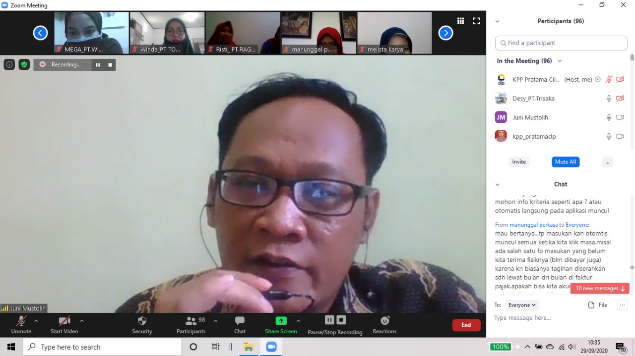 171 Pengusaha Kena Pajak mengikuti kegiatan sosialisasi Implementasi Prepopulated Pajak Masukan dan SPT Masa PPN pada Aplikasi e-Faktur yang diselenggarakan secara virtual di KPP Pratama Cilacap (Selasa, 29/9).